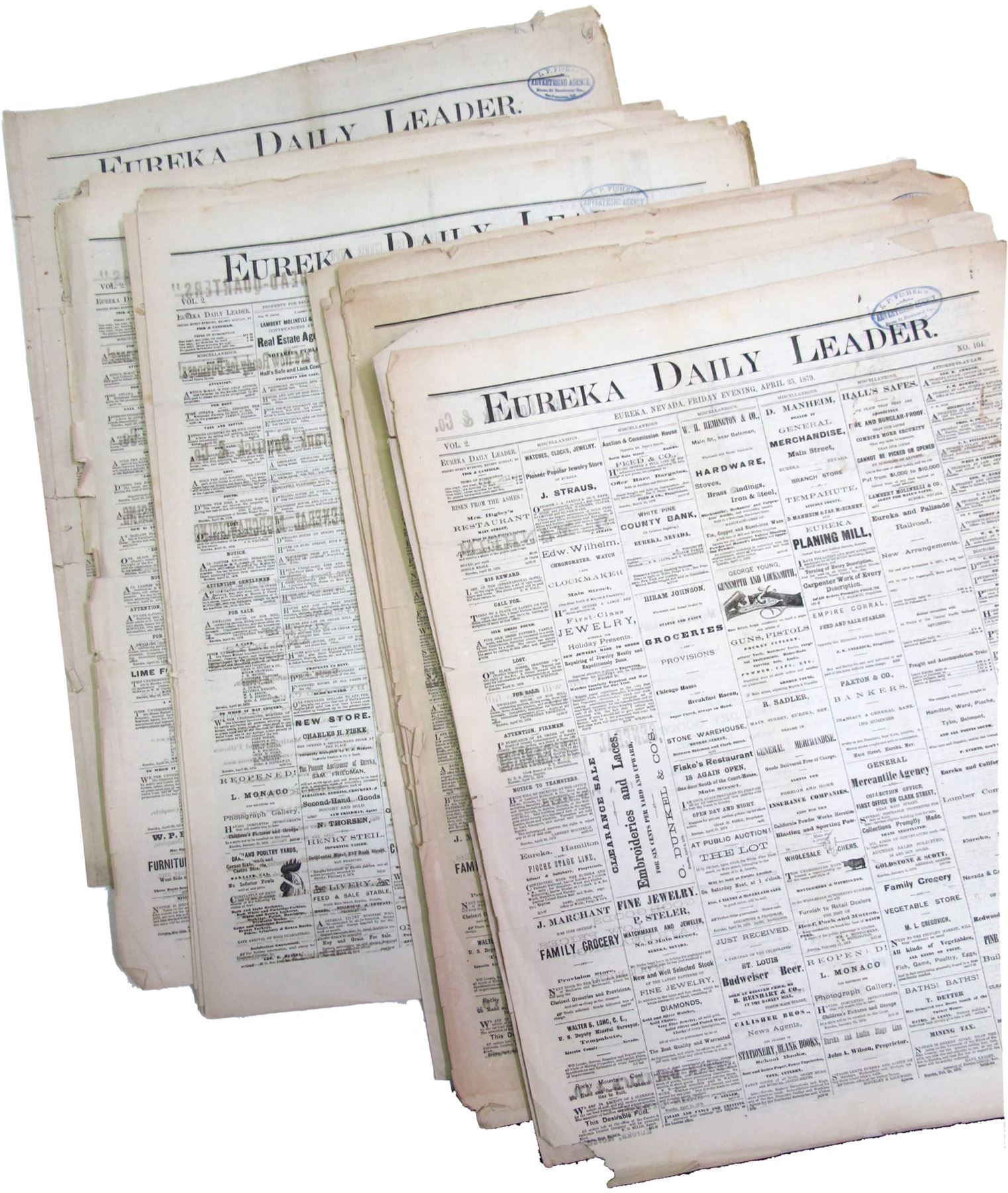 Early Eureka, NV newspaper, approx 20. 2 Daily Sentinal 1876. 18 Eureka Daily Leader 1879. Some wear, normal for age. State: Nevada City: Eureka Date: 1876-1879 HWAC# 85137