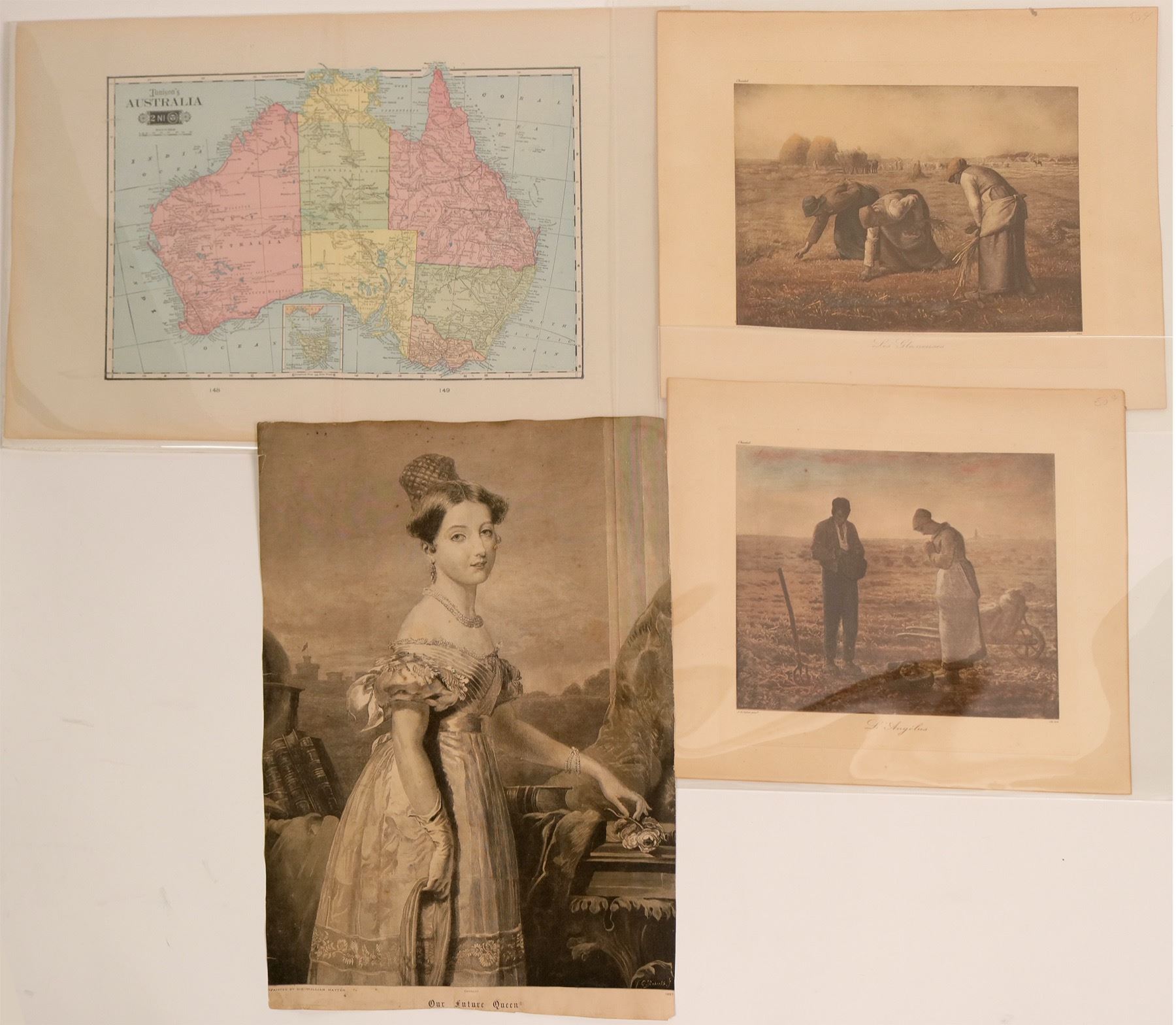 Two FF Miller very high quality matted prints 1) "Les Glaneuses" No. 644, 8" x 11" on 14" x 16" matte and 2) "L'Angelus" No. 102, 8.5" x 10" on 13" x 14" matte. Two French map lithos from the Atlas National Illustre by "a Paris, chez Combette Editeur. Rue del la Parcheminerie" 3) Dept De Maine Et Loire and 4) Dept De L'ariege. Both measure 14" x 21" in rough condition. 5) 1887 Litho of painting by Sir William Hayter entitled "Our Future Queen", 13" x 19". 6) 1944 Photo Litho Emergency Reproduction of Australian Chart Titled: Dutch New Guinea Padaido Islands Mios Woendi Anchorage, Surveyed by Lieut. Commr. D'A. T. Gale R.A.N. Assisted by Officers & Recorders H.M.A.S. "Benalla" and U.S.S. Y.M.S. 52 & 73. Stamped 'RESTRICTED" on the bottom. Bottom center: Australia. Published by the Hydrographic Branch, Dep. of the Navy 23rd August, 1944 under the Superintendence of Commander K.E. Mom, R.A.N. Bottom corner: Aus 074 H.O. Miscel. No. 9575-82. 18" x 28" folded in half. 7) Color map titled: Tunison's Australia. 15" x 23"