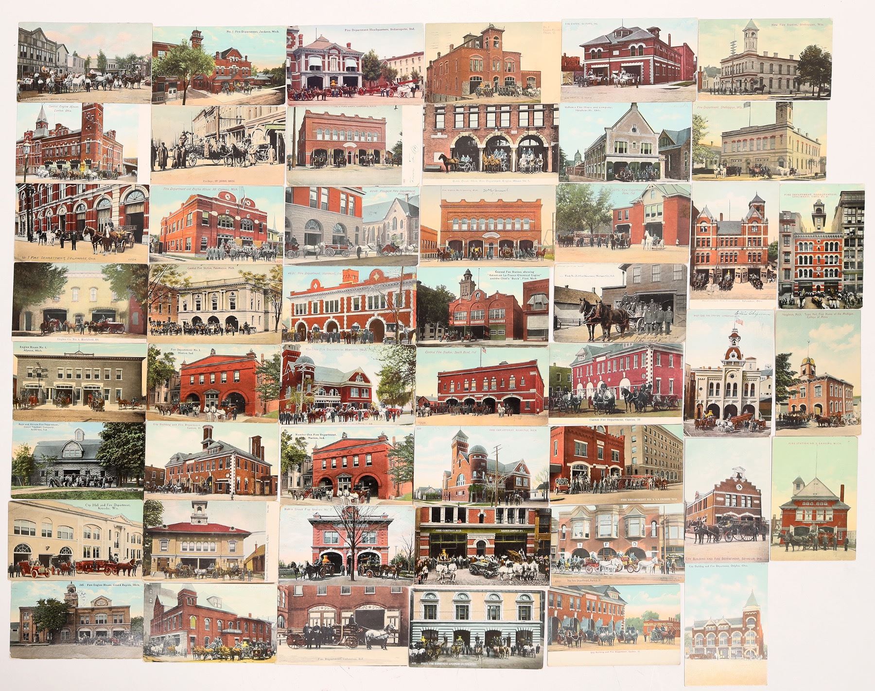 Early Great Lakes Region State Firehouse Postcards (49). All are in color and have apparatus and horses on display Illinois (6). Wisconsin (5). Indiana (11). Ohio (12). Michigan (15) No Duplicates. 1908-1916.
