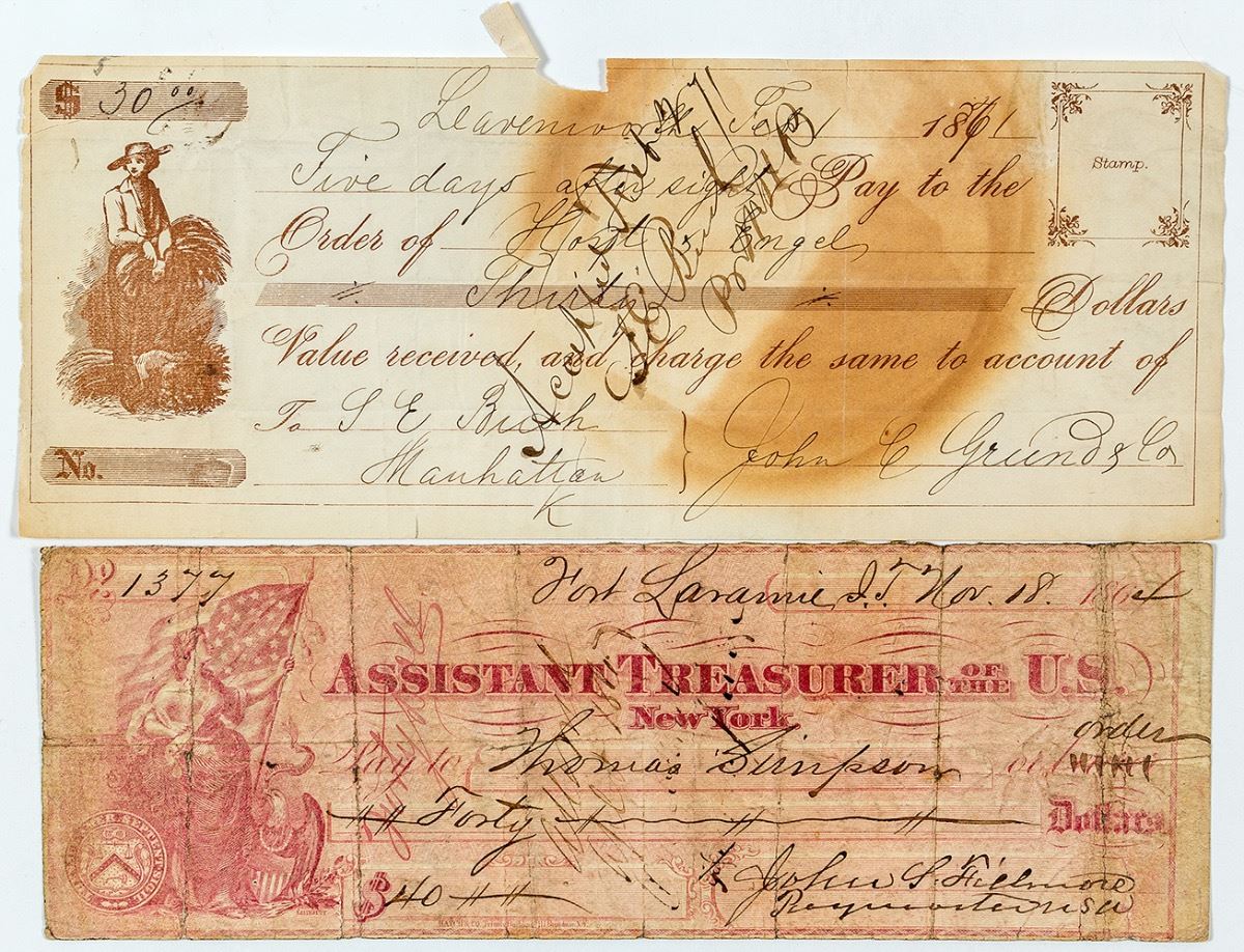 Two checks: Fort Laramie, Idaho Territory, Nov. 18, 1864 from the Assistant Treasurer of the U.S. to Thomas Simpson; and Leavenworth, 1871, pay to the order of Horst Engels for thirty dollars. City: State: United States Date: hwac# 35126