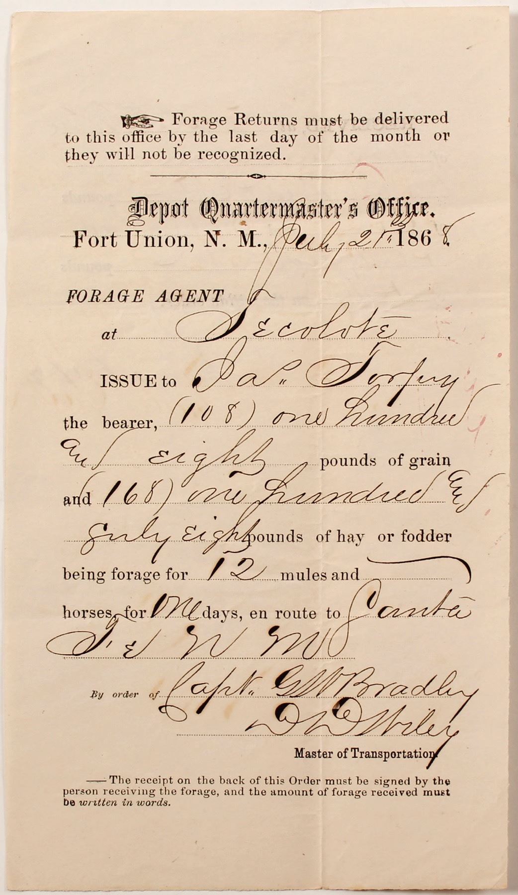 Depot Quartermaster's Office, Fort Union, N.M., July 21st, 1868. Addressed to the forage agent as Tecolote to distribute 108 lbs grain and 168 lbs of hay for horses and mules en route to Santa Fe. By order of Captain Bradley. 8.5 x 4.5" Folds. Fort Union operated from 1851-1891. By early 1851 Indian raids in New Mexico and along the Santa Fe Trail demanded that something more be done by the troops stationed in the region. Located near the Mountain and Cimarron branches of the Santa Fe Trail by Lt. Col. Edwin V. Sumner, commanding Military Department No. 9. [Read a full history here: https://www.nps.gov/foun/learn/historyculture/upload/TOME-2.pdf] Date: 1868 City: Fort Union State: New Mexico HWAC# 67044