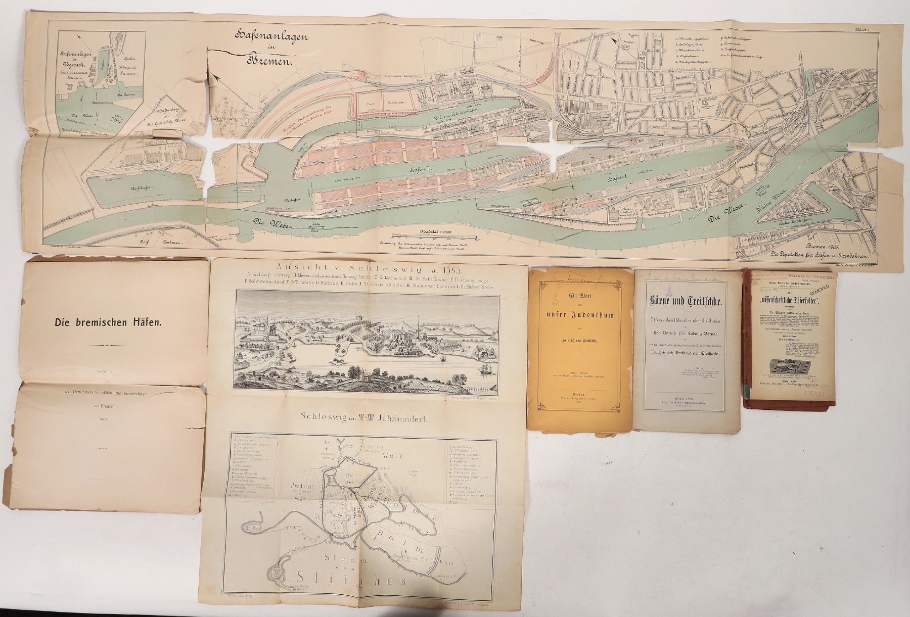 This lot has sea port maps for Brennen, Germany very fragile; a thirteenth century map of St. Paul's Monastery, and a book on the scientific study of animals 1899, loose covers. A paperback book "Our Judaism" 1880; another paperback "Judaism Unveiled" 1880.