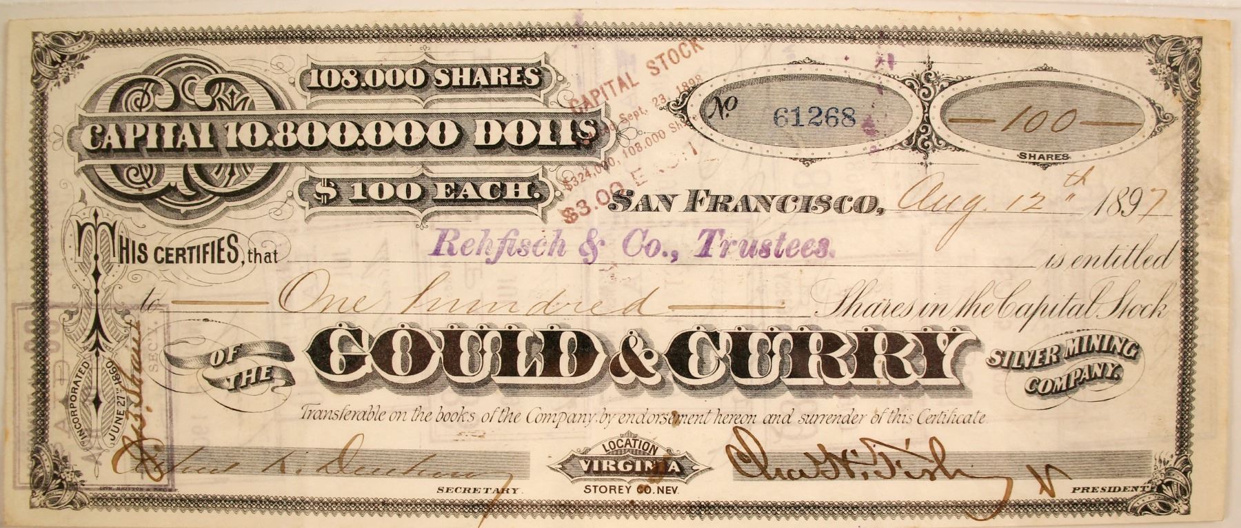 Issued #61268 to Rehfisch & Co 1897, 100 shares. Signed by President Fisher. In Pass-co fine holder. City: Virginia City State: Nevada Date: 1897