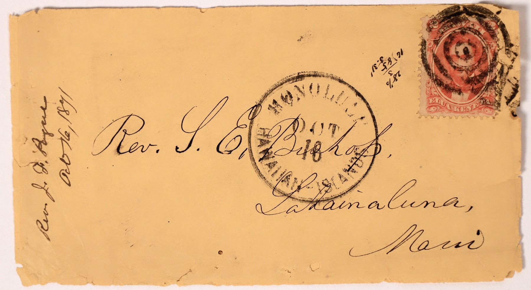Target postmarked two cent Elua Keneta stamp; sent from Honolulu to Rev. S. E. Bishop, Lahainaluna, Maui, Oct. 16, 1871. 5 1/2 X 3 inch envelope.