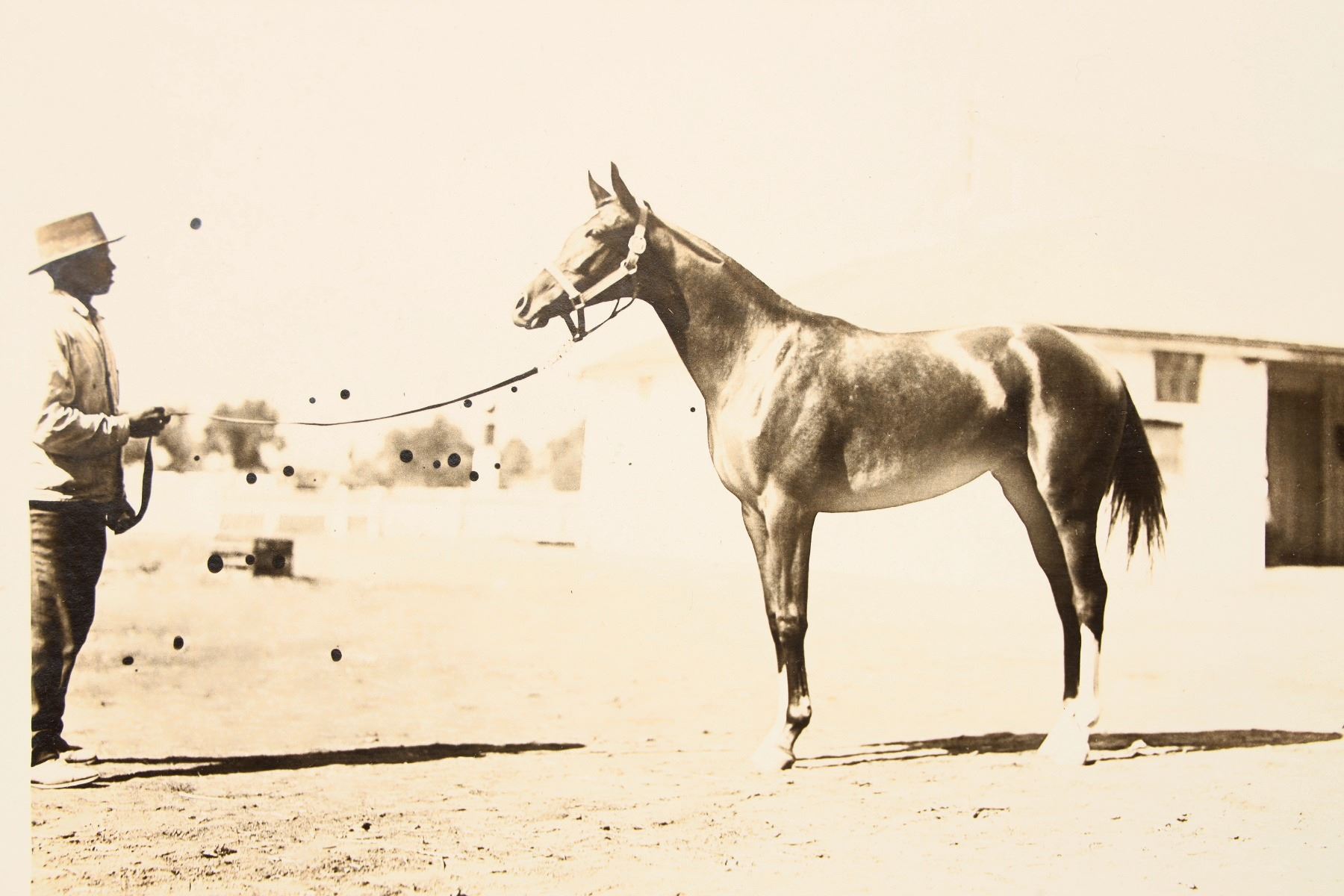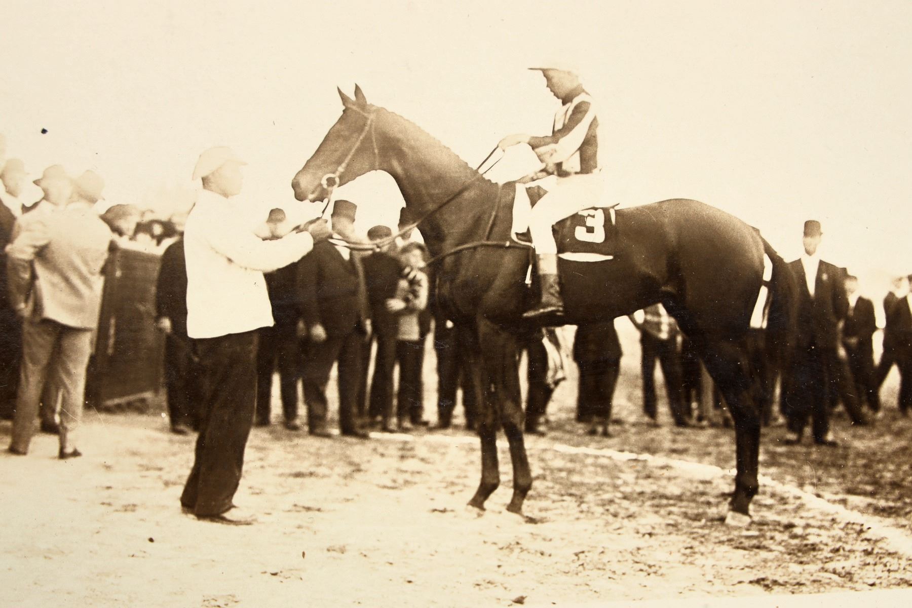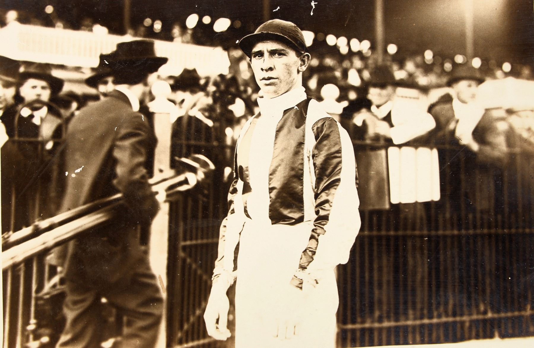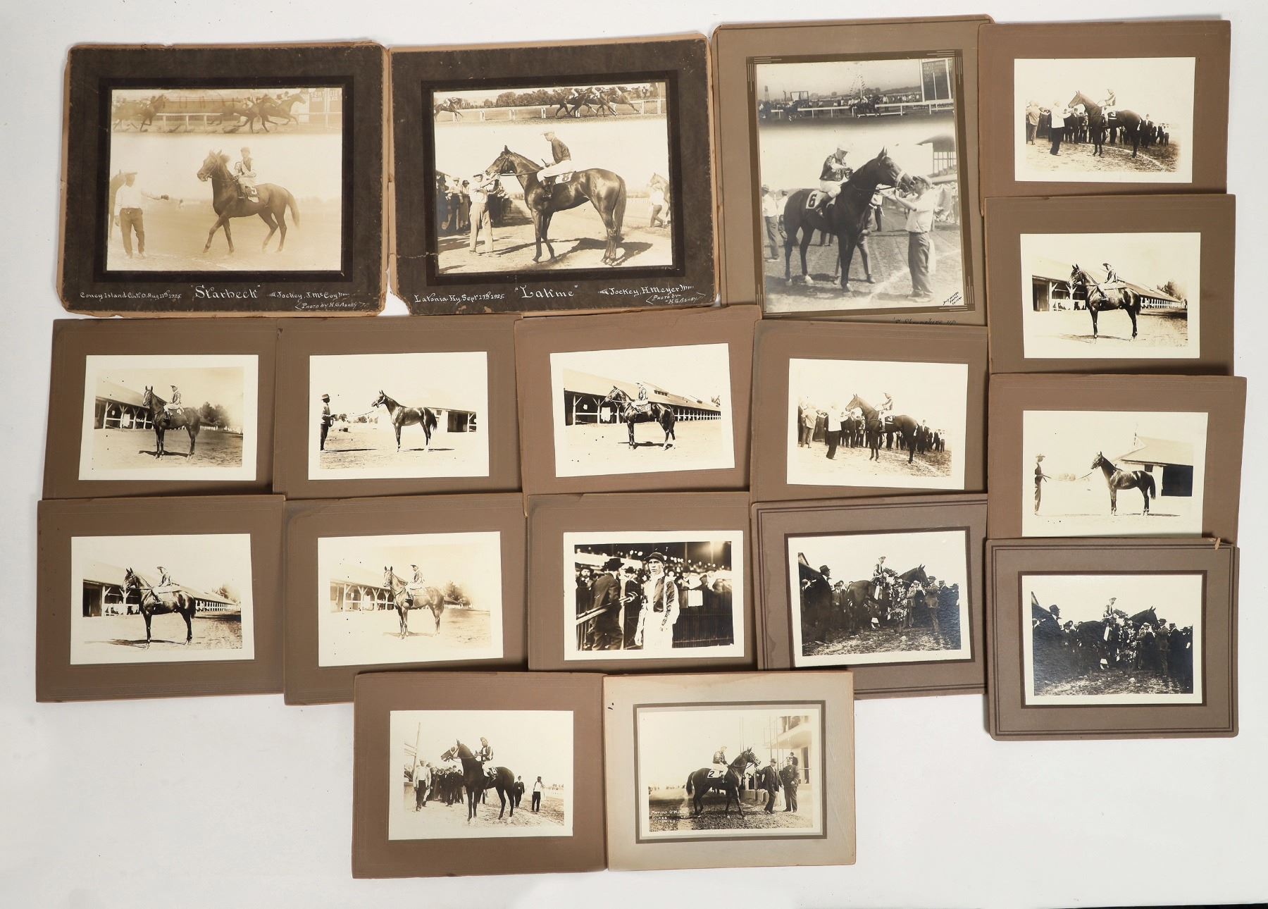 Lot of 17. 1) 14 roughly 8 x 10" mounts with photos of jockeys on horses. Not identified. Some duplication. 2) Three larger mounted photographs, identified. Includes: "Starbeck" and jockey, Coney Island, 1925, photo by HG Ashby, 11 x 13"; "Lakme" and jockey, Latonia, Kentucky, 1925, photo by HG Ashby, 11 x 13"; and "General Grant", Washington Park, 1927, Bob White Photo, 13.5 x 11.5".