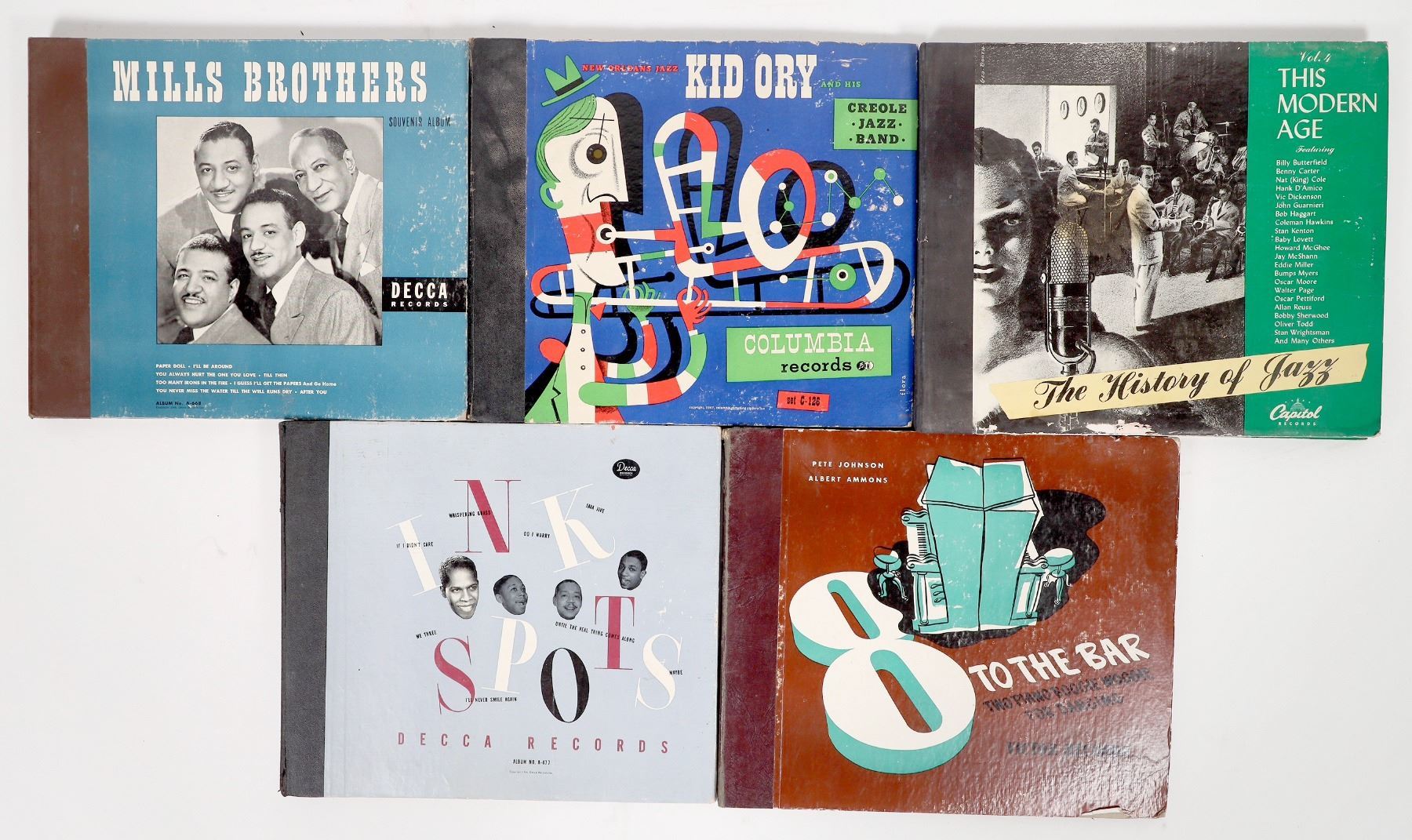 Group of 5 albums of early jazz, dixieland, pop, and ragtime music, all dating from the 1940s and 1950s. The lot includes 'New Orleans Jazz' by Kid Ory's Creole Band (1947), 'Souvenir Album' by the Mills Brothers (1951), 'Two Piano Boogie Woogie For Dancing' by 8 to the Bar (1946), The Ink Spots' self-titled album (1946), and a compilation album titled 'The History Of Jazz Vol. 4 - This Modern Age' (1945). No missing records; one broken record in the 8 to the Bar album.