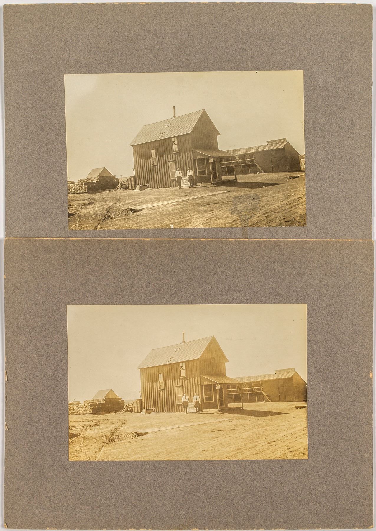1) Identified on back as 1914-1918. R. E. Owen on left and Ernest Snodgrass on right. of the Kirkland Lumber Company of Kirkland, Texas. Has a stain on bottom right of photograph. 2) Same as #1 but light. Both are 8 x 10" Framed. Photo is 6.5 x 4.25".