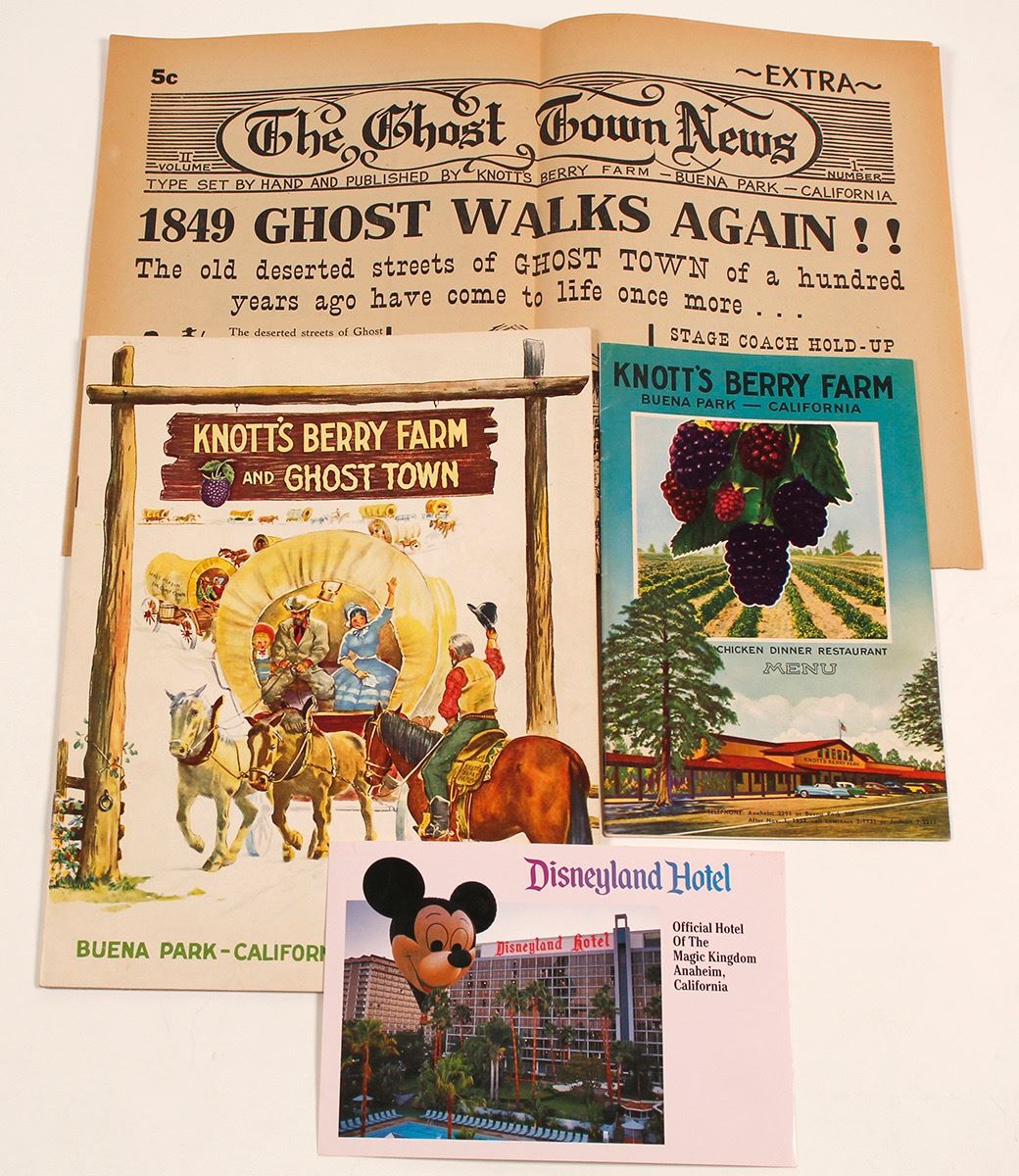 Lot of 4. 1) Color booklet with mailing envelope, c.1950s. "Knott's Berry Farm and Ghost Town." Pacific Press. Full of black and white photographs. Tells the story of the farm. 34 pages. 11" x 8.5" Also a souvenir newspaper, "The Ghost Town News," published by Knott's Berry Farm that likely came in the same envelope. 2) Knott's Berry Farm Chicken Dinner Restaurant Menu. Color. c.1954. 8.25" x 5.25" 3) One unused real photo postcard for the Disneyland Hotel. Later. (Prag Collection) Date: Location: Buena Park, California HWAC# 55677