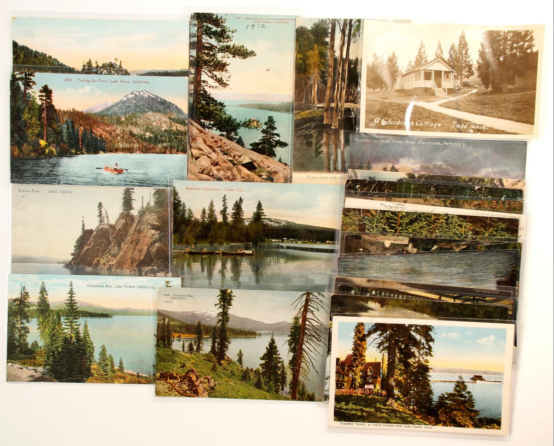 Lot of 21 different. All early printed cards with one real photo. Earliest is a Donner Lake with a 1904 Tahoe cancel. Latest is the real photo which shows a cottage at Glenbrook with a car parked next to it (probably c.1930) (worth the low estimate by itself!). Views of the Tahoe Tavern, many scenic including Emerald Bay, Cave Rock, Glenbrook, Carnelian Bay, etc. Thirteen are mailed incl. rare Stateline, CA and Deer Park cancels! City: Lake Tahoe State: California Date: HWAC# 78631
