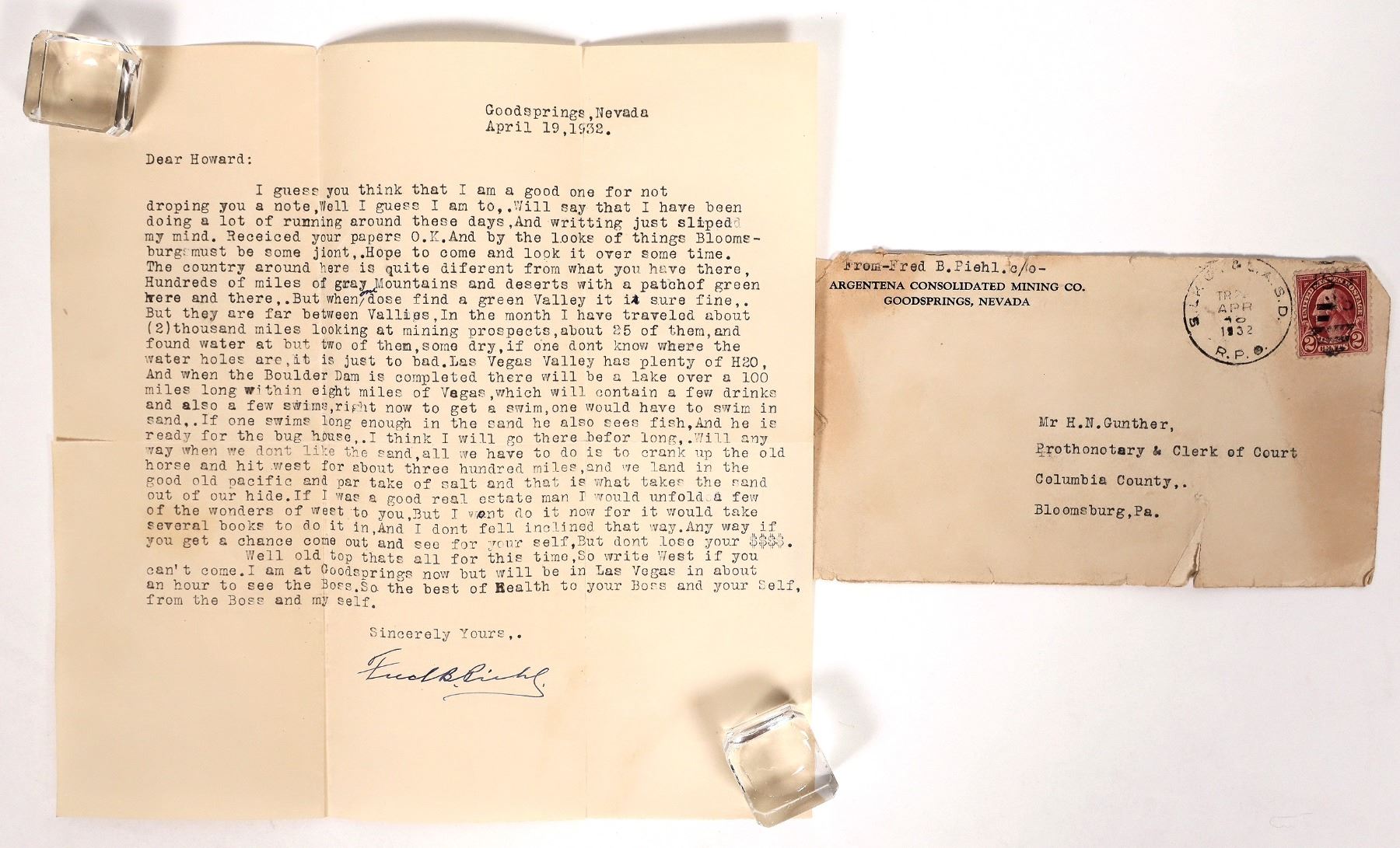 Typewritten letter from Goodsprings Nevada, April 19, 1932 addressed to Mr. H. N. Gunther, the Prothonotary & Clerk of Court in Bloomsburg, Pennsylvania, from Fred B. Piehl of the Argentena Consolidated Mining Company. Amusing letter about travelling "about (2) thousand miles looking at mining prospects" and the future of Las Vegas Valley when the Boulder Dam is completed. Red two cent Washington stamp, postmarked South Dakota. (A prothonotary is the chief clerk of a civil court and is responsible for recording and filing legal documents)