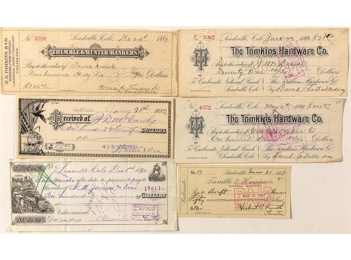 Lot of 6. Some pictorial. 1) 1880 loan document with locomotive vignette. 2) 1882 w/ ornate border and vignettes. 3) 1887 H.H. Tomkins & Co., Hardware and Mine Supplies. 4) 1887 Timble & Hunter, Bankers. 5) Two Tomkins Hardware Co. checks (1889 and 1890), one to Colorado Coal & Iron Co. Cut cancels and light soiling. Nice set! (Prag Collection)