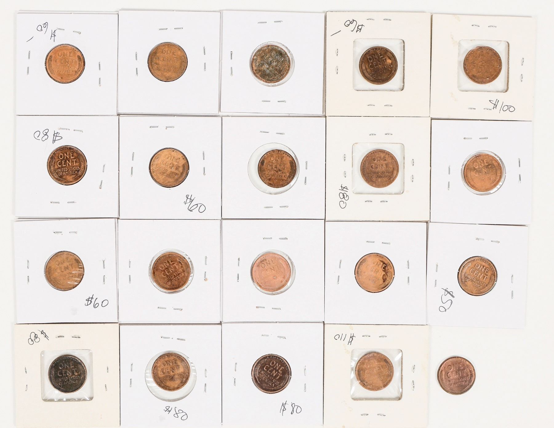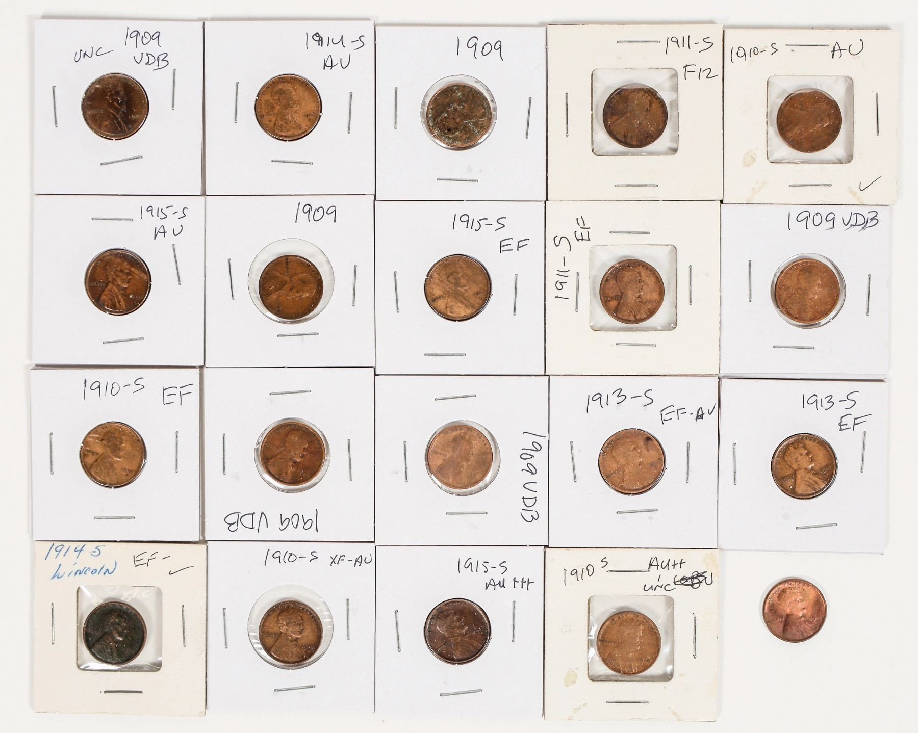 Twenty higher grade early Lincoln cents: 1909 (2): F-EF, EF-AU; 1909 VDB (4): AU-Unc, EF-AU, F-VF, VG-F; 1910-S (4): EF, EF-AU; AU; AU-Unc; 1911-S (3): VF-EF, EF, F; 1913-S (2): EF, EF-AU; 1914-S (2): EF, AU; 1915-S (3): EF, AU, AU.