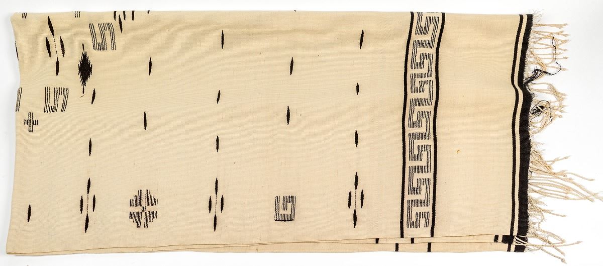 Early Mexican Saltillo weaving, 39" x 77". Good condition, a lot of fringe missing, small holes and stains. State: zMexico City: Date: FHWAC#: 41452