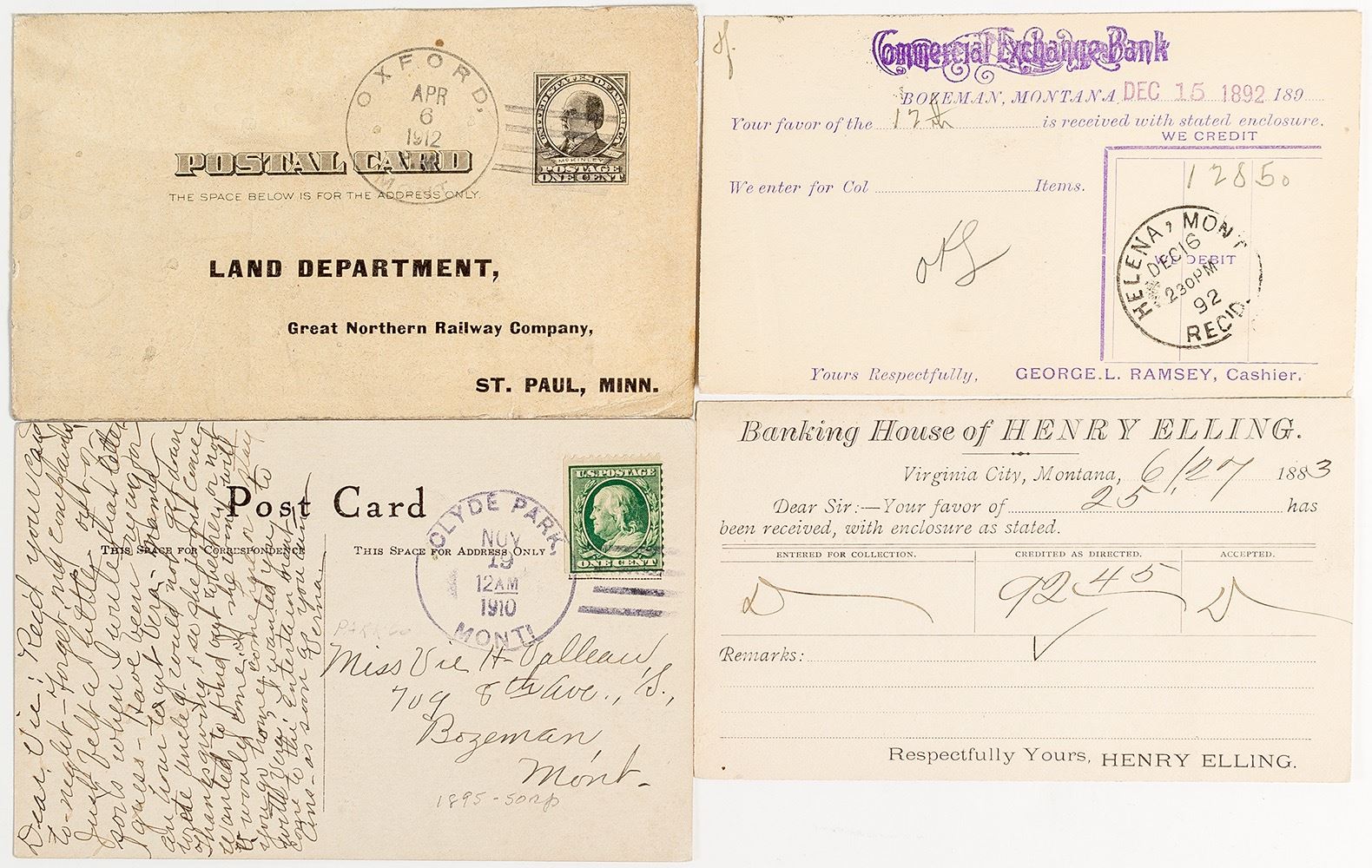 Lot of 4. 1) June 27, 1883 from Virginia City, MT. It is from the Banking House of Henry Elling to E. W. Krught Cash of the National Bank of Helena. 2) December 15, 1892 from the Commercial Exchange Bank of Bozeman. 3) November 19, 1910. Issued from Clyde Park to Bozeman. 4) April 12, 1912 from the land Department of the Great Northern Railway Co. of St. Paul, Minnesota to Judith Gap. State:Montana City: Date: ID#43906