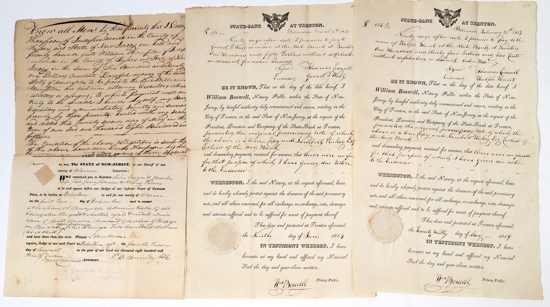 4 early New Jersey documents. 2x 1819 State-Bank at Trenton notarized payment documents, Wm Boswell, Notary. Undated obligation letter signed by Geo. Thompson. 1837 Warren County court summons.