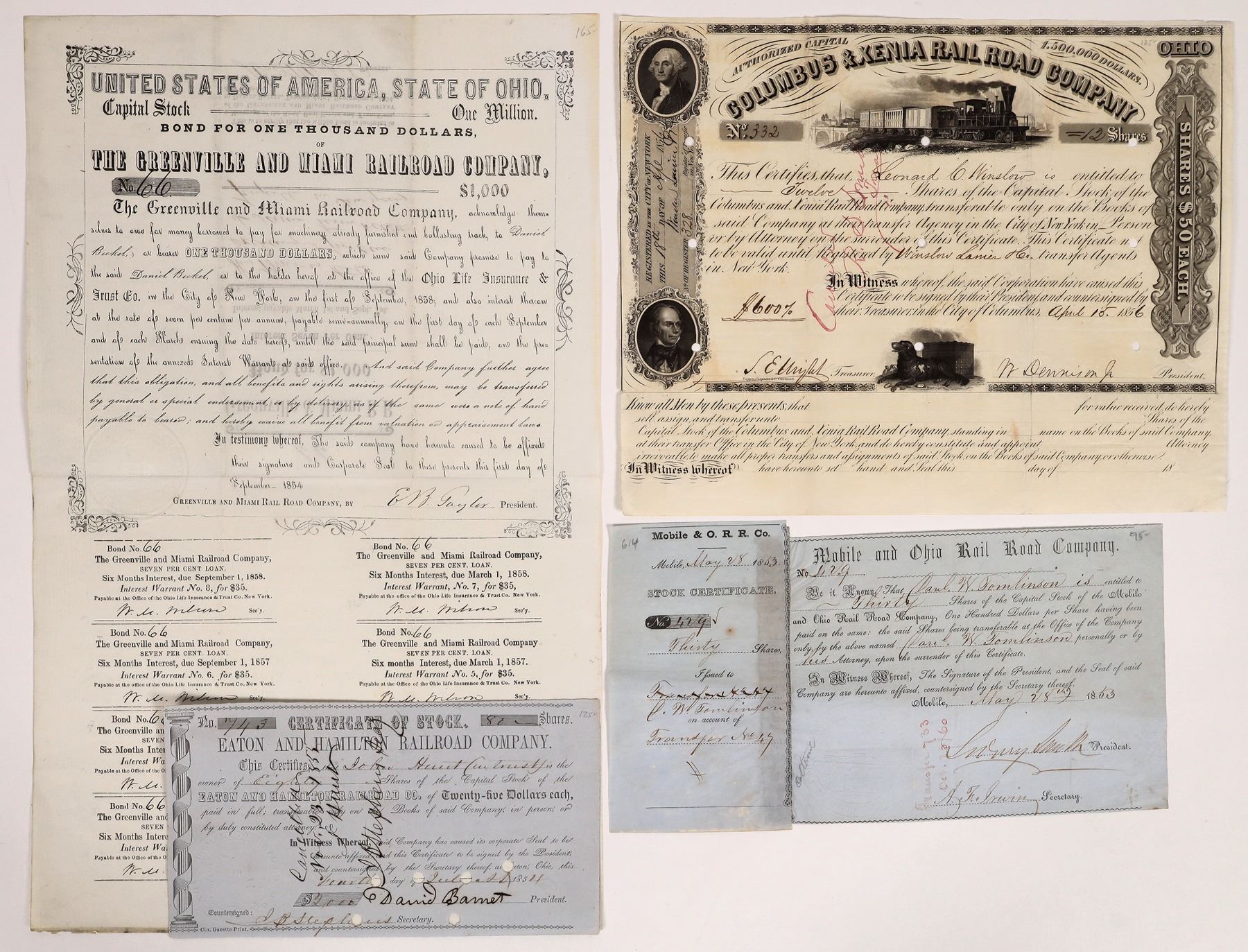 Lot of 4 different. 1) Eaton & Hamilton Railroad Company. Stock issued in 1854, punch and pen cancelled. 2) Greenville & Miami Railroad Company. $1,000 bond issued in 1854, not cancelled. 3) Mobile and Ohio Rail Road Company. Stock issued in 1853, pen cancelled. 4) Columbus & Xenia Rail Road Company. Stock issued in 1856, pen and punch cancelled. Please inspect.