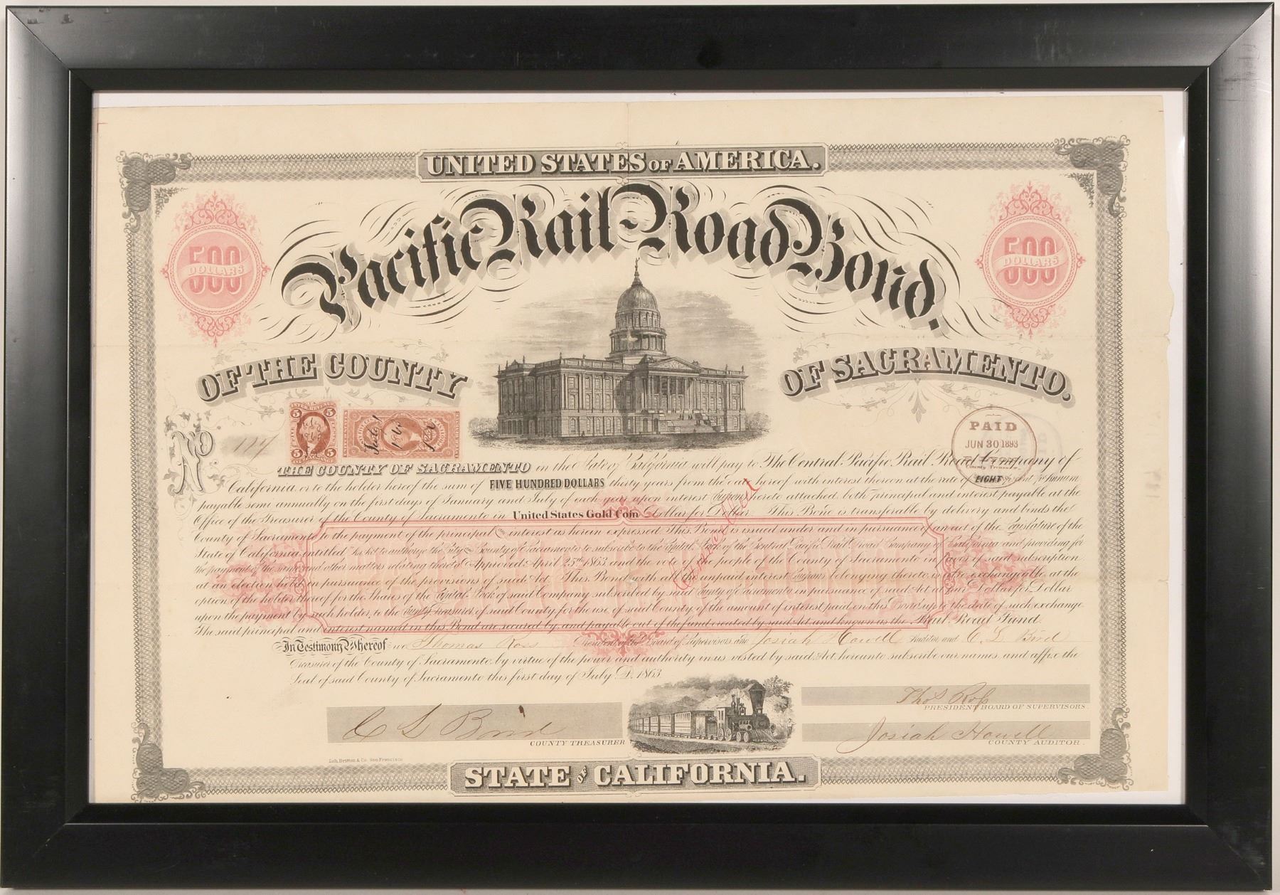 Framed. Bond #114 for $500. issued July 1, 1863 by the County of Sacramento. 17.25"x12.25" Cancelled written with Paid stamp. No coupons attached. Two revenue stamps, one for 25 cents and one for 5 cents affixed to the front. Very nice condition, rough right edge and one heavy vertical fold. It contains the signatures of county officers Thomas Ross, Josiah Howell and C. L. Bird. The bond was used to raise money for the First Transcontinental Railroad under Sec. 5 of the Pacific Railroad Act of 1862. Specifically, it was used to build the Central Pacific Railroad, which runs from San Francisco to Promontory, Utah. There it meets the Union Pacific Railroad line running back east, where the famous "Golden Spike" was driven to join them. Central Pacific Railroad was an extremely important railroad completing the railroad from the Atlantic to the Pacific Oceans. President Lincoln signed the Pacific Railway Act on July 1, 1862. This authorized the Central Pacific and Union Pacific to build the railroad to the Pacific Ocean. The railway line included over one dozen tunnels. The first rail lines were laid in 1863. Over 95% of the work was done by Chinese workers. Work completed seven years ahead of schedule. Financing created by governor of California and railroad baron, Leland Stanford, railroad baron Collis Huntington, American educationist, theologian and president of Williams College, Mark Hopkins and Charles Crocker, construction supervisor and president of Charles Crocker & Co. According to Heritage Auctions, there may be no more than a half-dozen of these still in existence.
