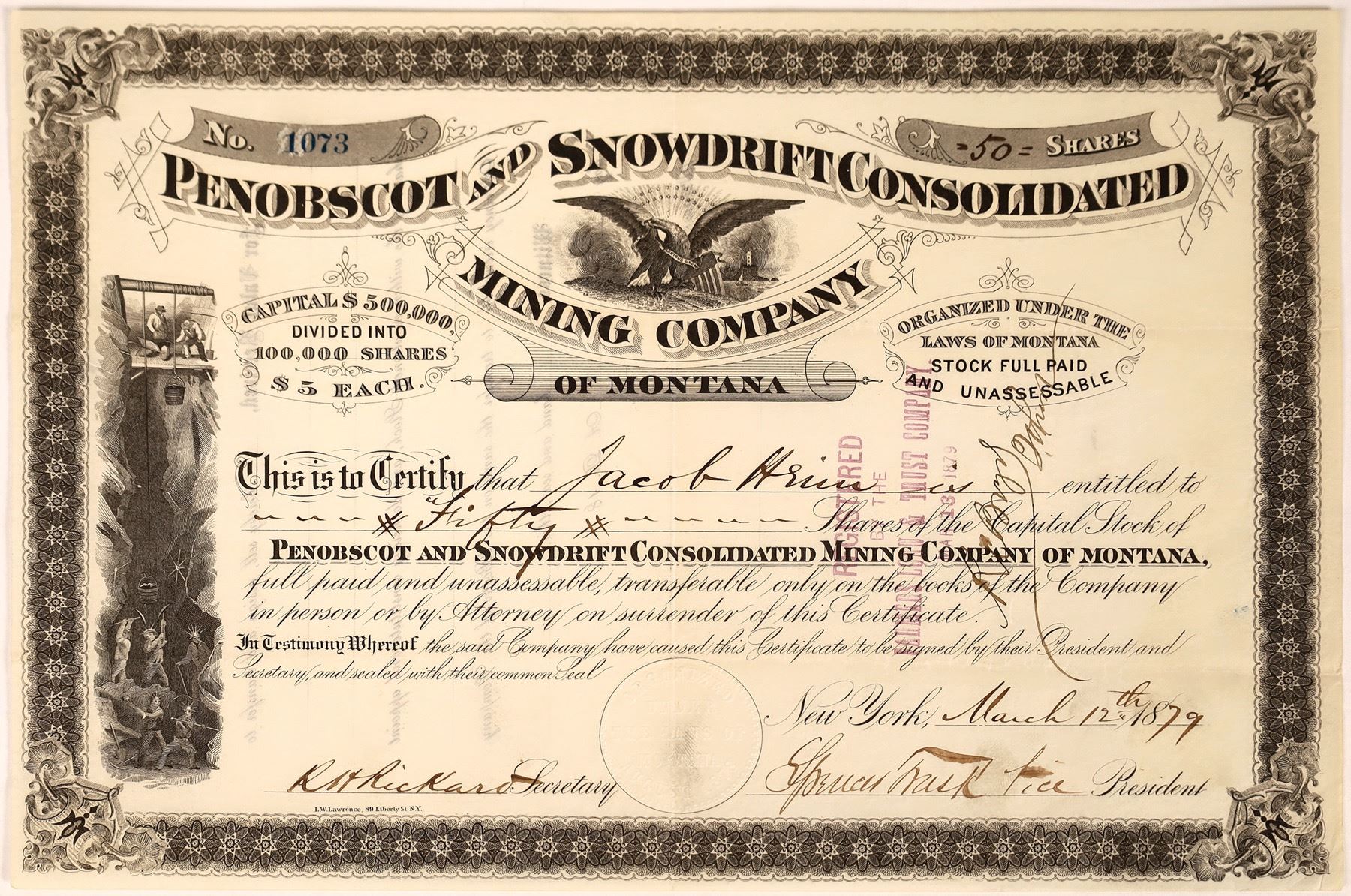 # 1073 for 50 shares to Jacob Hiener(?). Signed by RH Rickard and Spencer Trask vice president. Dateline New York, March 12, 1879. Miners moving ore buckets up and down a shaft by hand vignette. Printed by Lawrence of New York. Registered stamp center right. Light folding lower right corner. Otherwise extremely nice. "The historic name of the Marysville mining district is the Ottawa mining district. The only town in the region, Marysville, is about 18 miles northwest of Helena. The Belmont mine and 20-stamp mill was sold to the Penobscott & Snowdrift Consolidated Mining Company around 1878. The mill featured shaking copper plates in addition to stationary plates. These were attached to the four Frue vanners. These vanners were invented by William Frue, who controlled the Penobscott company. From December of 1878 to April of 1880, the mine produced $104,238 in bullion. The ore yielded from $8 to $20 per ton while expenses were about $6.50. The company enlarged the capacity of the mill to 30-stamps in 1881. That same year a fire and explosion resulted in the loss of six miner's lives. The mill continued to operate until 1885." [Montana Department of Environmental Quaility]