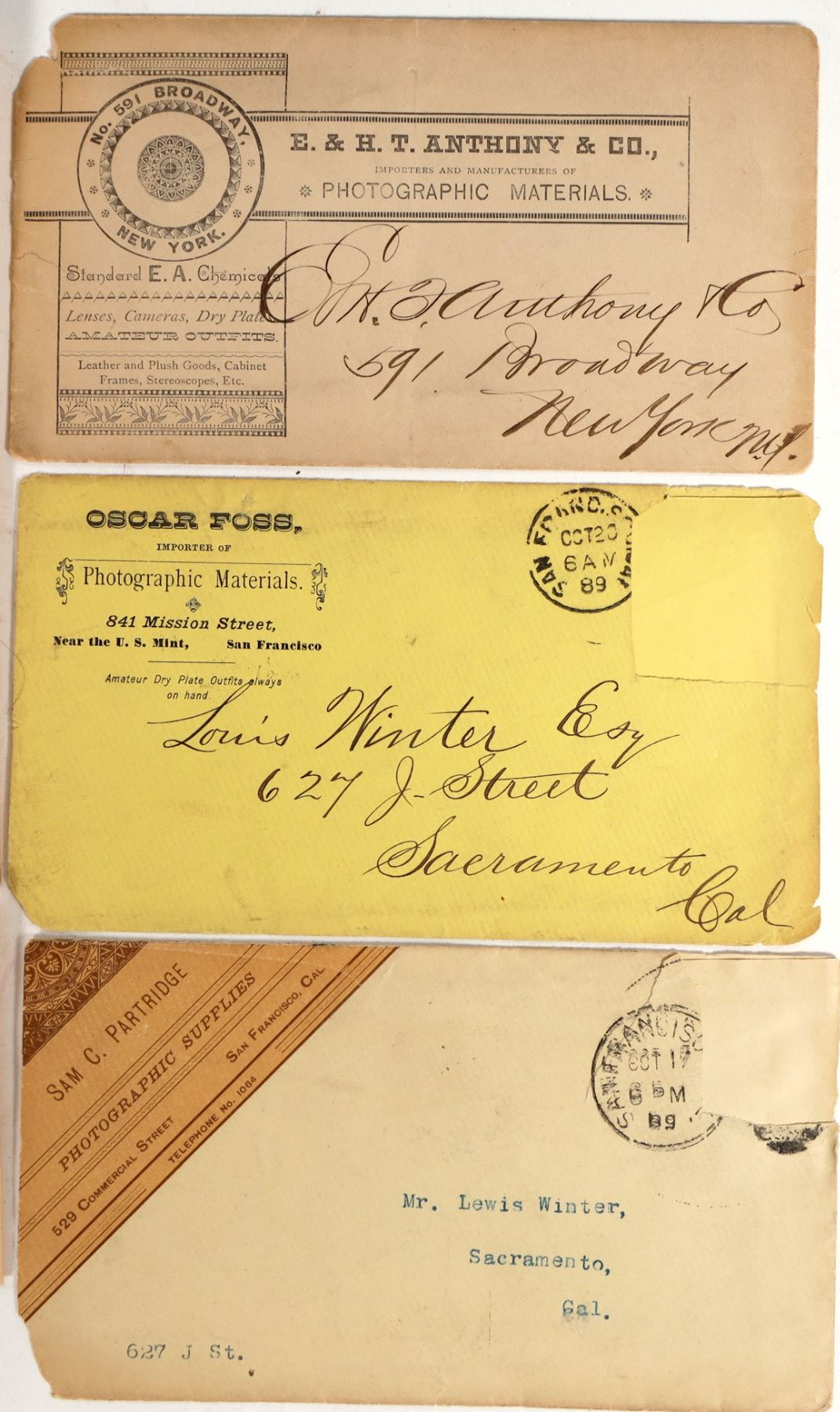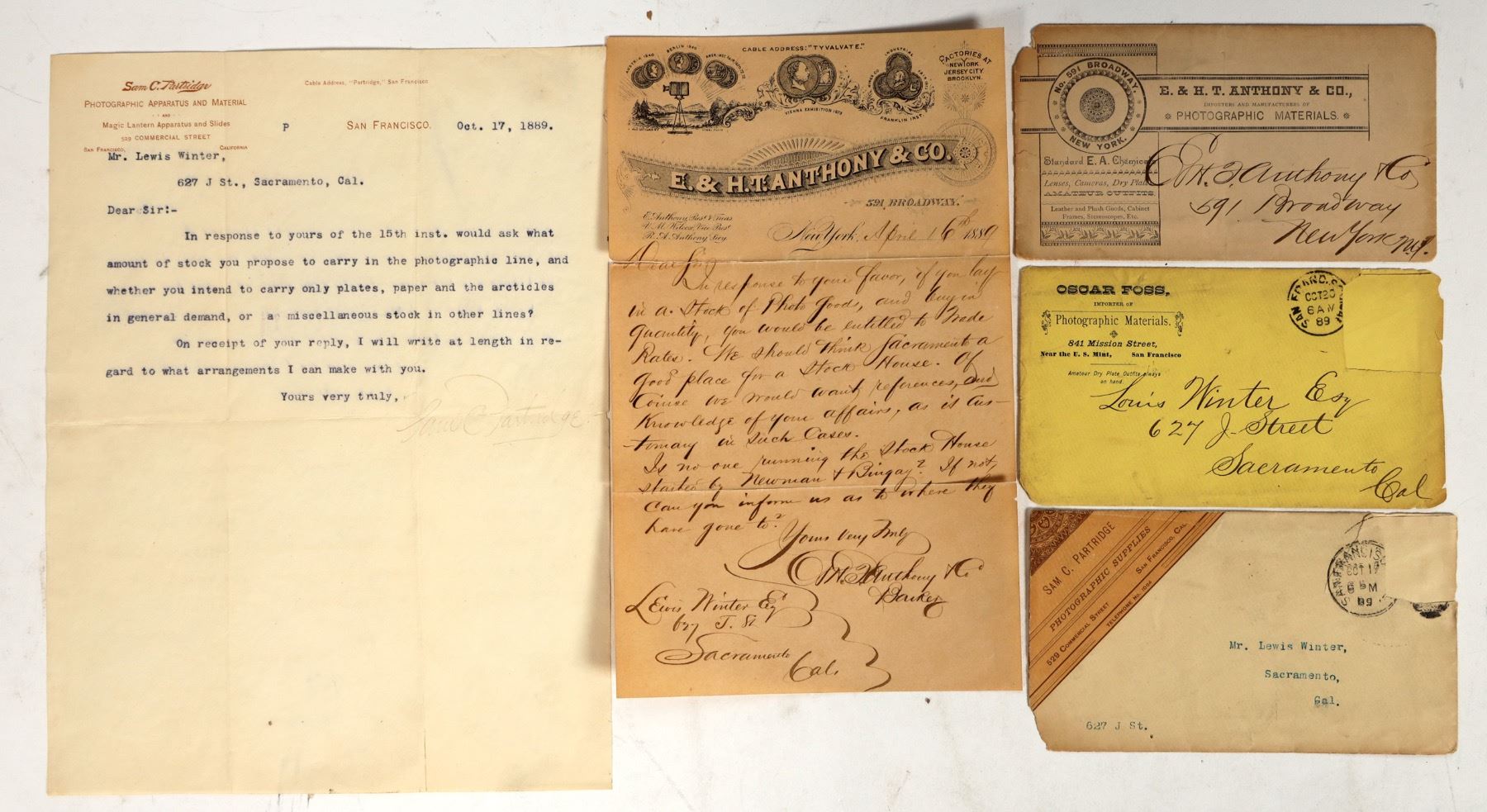 Lot of 5: three corner ad covers and two letterheads, all addressed to Lewis Winter of Sacramento, who was a teacher and artist who ran an engraving business. Messages on letterheads relates to photo supplies. 1) Pictorial letterhead and corner ad cover for E&HT Anthony & Co. of New York, 1889. Well-known producers of stereoviews. Toning and tears along folds. 2) Letterhead and cover from Sam C. Partridge, Photographic Supplies dealer in San Francisco, 1889. 3) Corner ad cover for Oscar Foss, Importer of Photographic Materials in San Francisco. 1889. No contents.