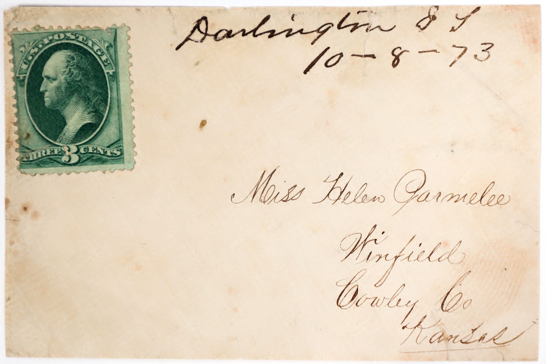 Darlington was located in the region later to be included in Oklahoma Territory. It was the site of the Cheyenne and Arapahoe Agency. Established in 1870 by Brinton Darlington, the agency was on the banks of the North Canadian River. This 4 x 2 1/2 inch postal cover is dated 10-8-73, with green 3 cent stamp upper left. Addressed to Miss Helen Parmelee of Winfield Kansas.