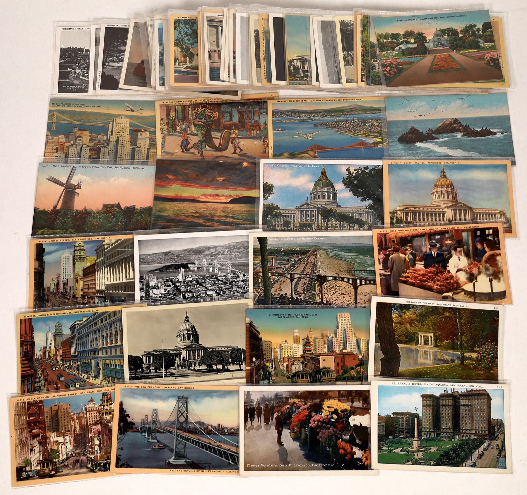 Collection of 96 postcards, both RPC and Litho of colorful and black and white San Francisco scenes from the 1910s-1940s. Most are blank, with five bearing stamps and San Francisco cancels from 1911, 1929, 1940, 1944 and 1949.