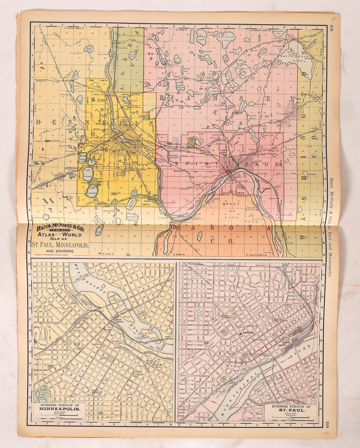 4) St.Paul & Minneapolis and Environs - 1891 - Shows street transportation lines in red and insets of the business portion of both cities - (27-1/2" x 21-1/2")