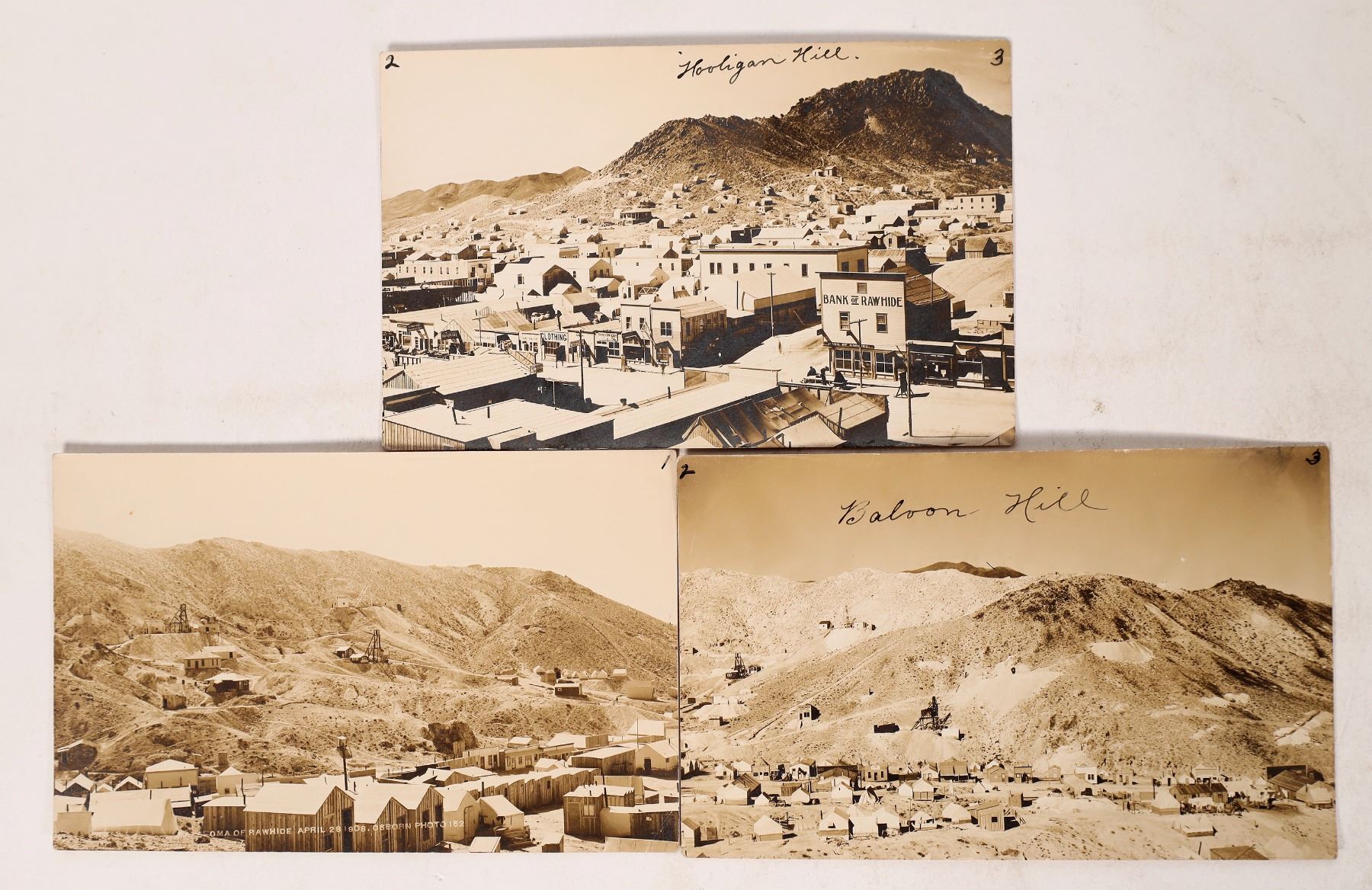 Three early postcards include Balloon Hill, Oma of Rawhide, and Hooligan Hill. Rawhide Nevada