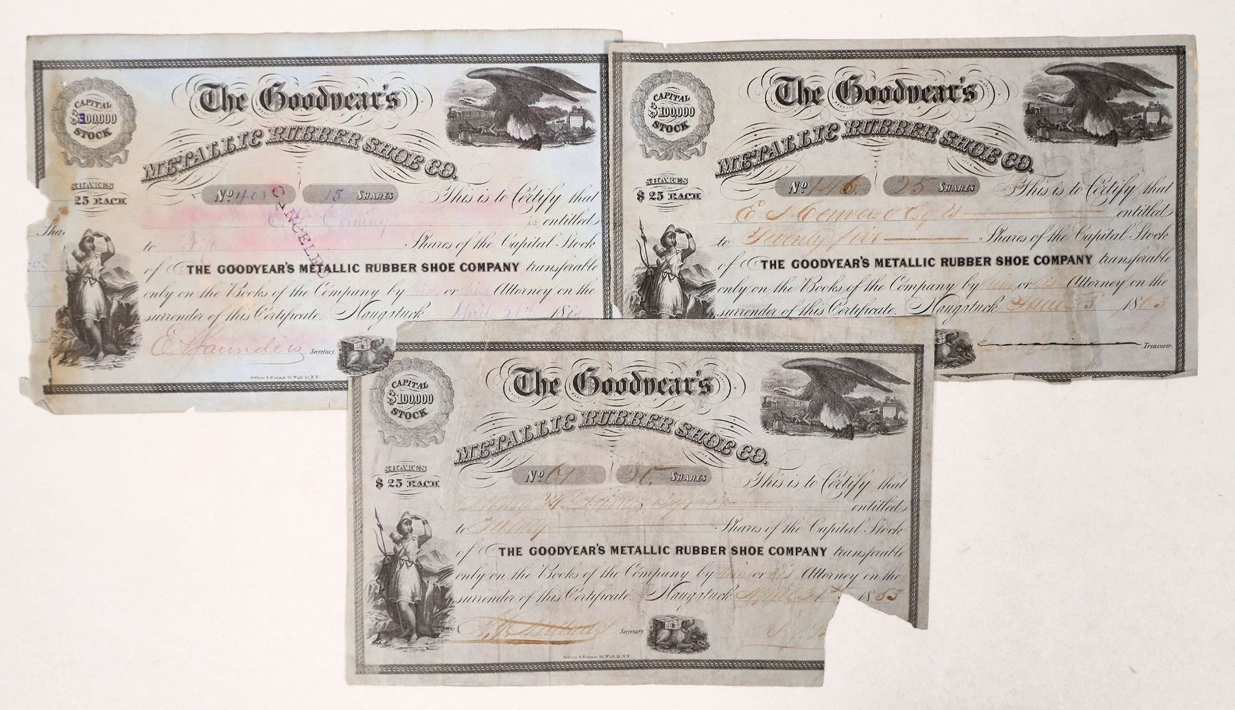3 stock certificates from the Goodyear's Metallic Rubber Shoe Company, dated 1859 to 1884. The certificates are all issued and signed by secretary and treasurer, though a few signatures are extremely faded or damaged. One is cancelled using a stamp cancellation. The stocks are in varying condition, with some being heavily torn; see photos. The Goodyear company, which was based in Naugatuck, CT, had a patent for producing shoes and boots out of vulcanized rubber.