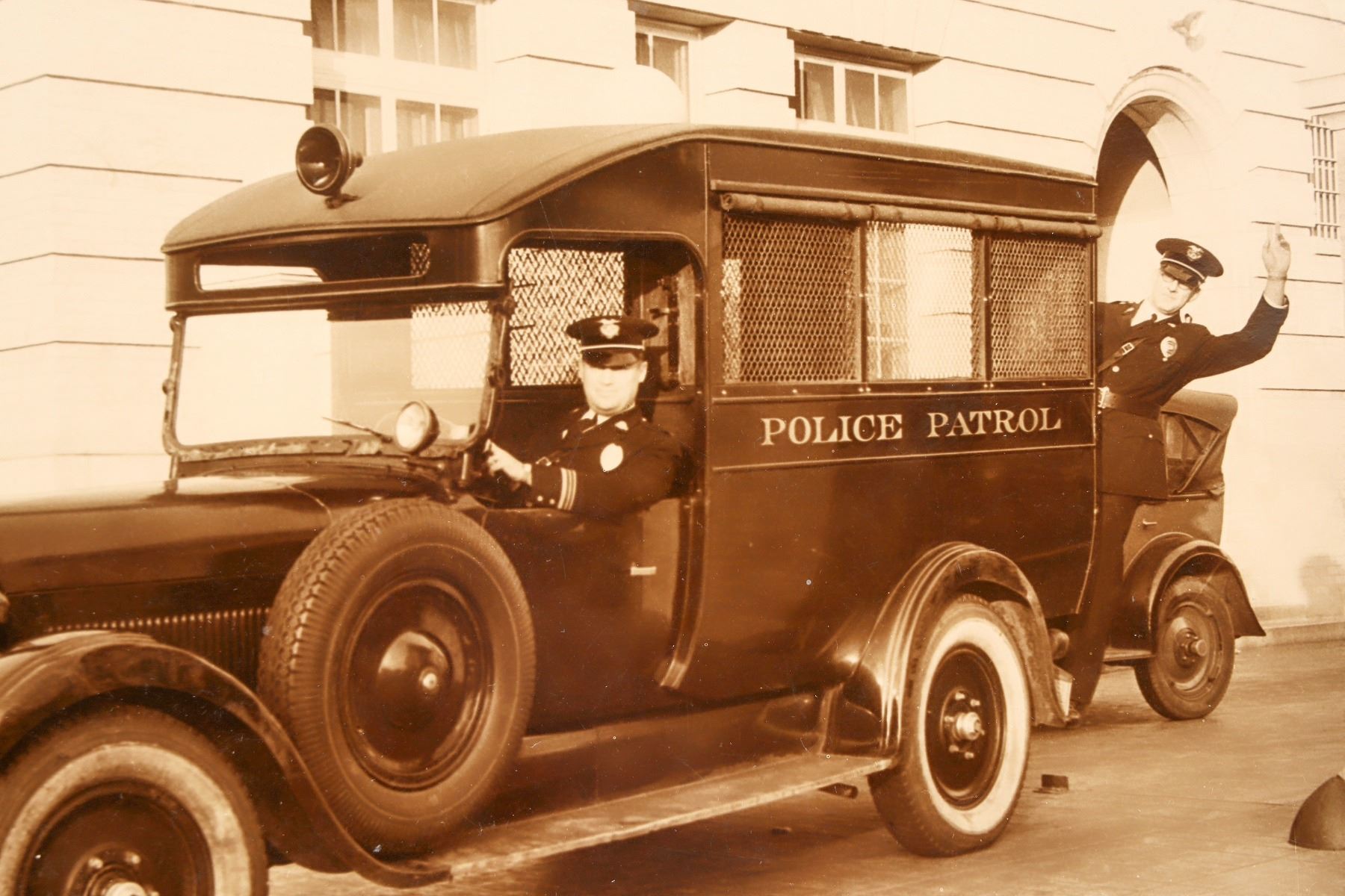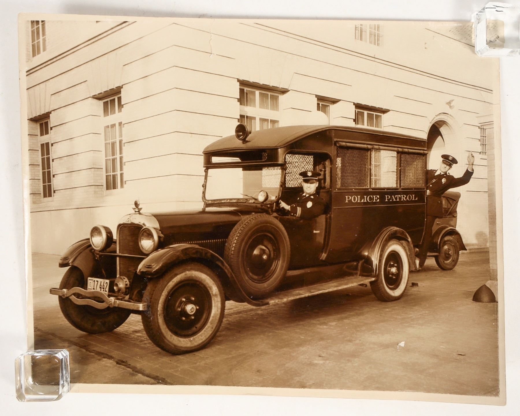 8 x 10" photo of a police patrol vehicle with two policeman posing. Marked "Sacramento Uncle Wm" on reverse. Tape repairs.