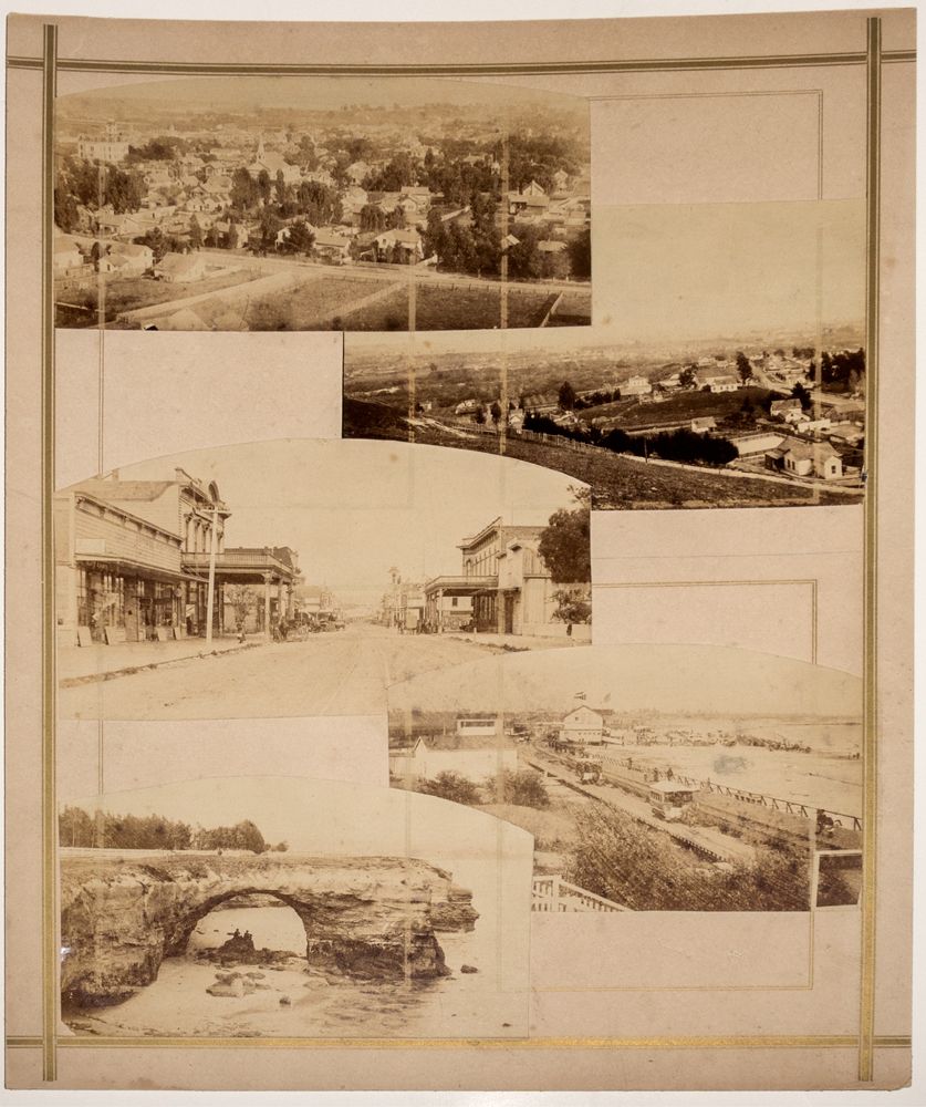 Five mounted photographs (on a single board, 16" H x 12" W) of Santa Cruz. Views are of the city, the downtown with businesses, horses/buckboards, a bridge for people and trolleys and an arched rock formation. Burger Collection