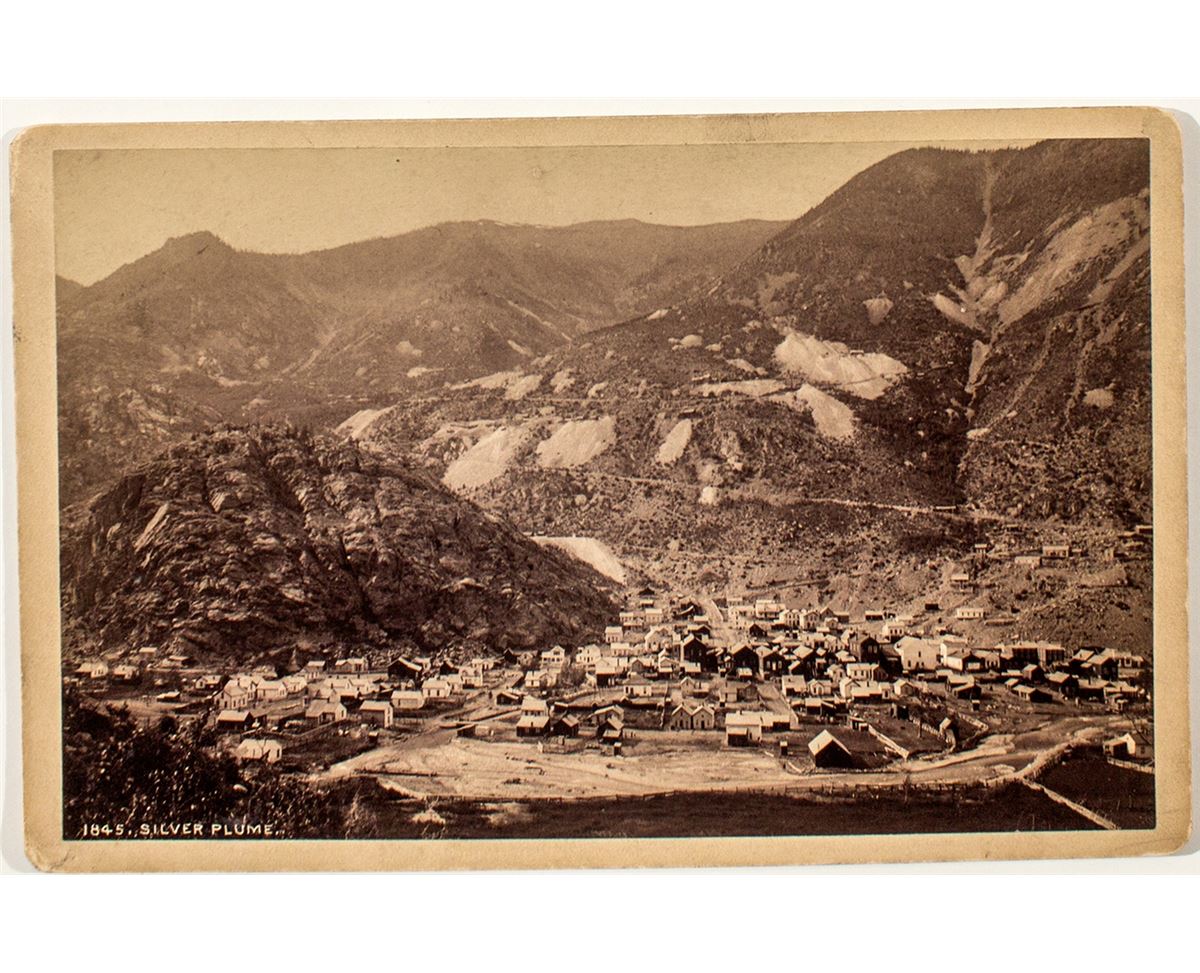 W. H. Jackson photograph showing the town of Silver Plume. There is strong contrast on this photo and all of the building are clearly defined. If one wanted to, he could find many of these buildings still standing. Tailings and cuts in he mountains for roads are clearly seen. Silver Plume is a very small, old, rural mining town dating from the Colorado gold and silver rush of the last four decades of the 19th century. In 1859 gold was discovered at the confluence of Clear Creek and the Platte River near what is now Denver. The sought-after veins of ore were part of the east-northeast Colorado ore belt running roughly from Boulder, Colorado southwest to the vicinity of Silverton and Telluride. It is believed that originally some two miles of overburden covered the ore veins. Erosion caused by wind and water wore away the overburden down to the upper level of the ore--just in time for the mid-19th century prospectors to “strike it rich,” sell their claims to mining companies, and trigger the creation of towns like Silver Plume. Although gold was the original metal sought in the Silver Plume area, by about 1864 some bright soul recognized that the grayish rock everyone had been kicking around and cursing was in fact silver ore, and the boom era for Silver Plume began. (Prag Collection)