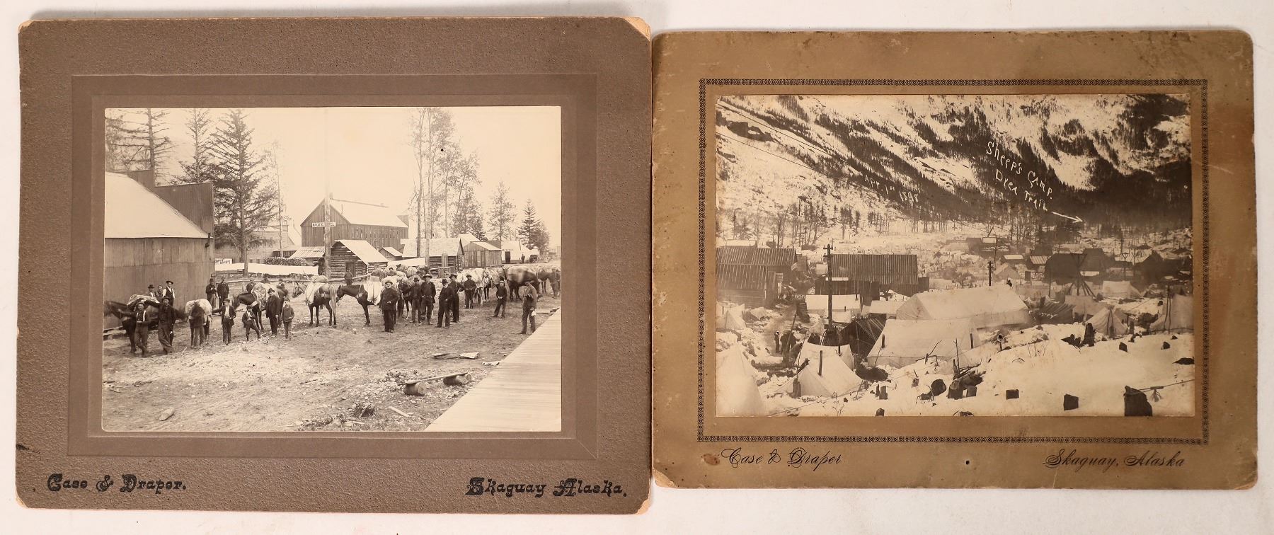 Skagway, Alaska photos taken by Case & Draper of Skagway in 1898. Photos measure 7"x 9". One shows a snowy Sheep's Camp, the other, a group of miners with pack animals. This one is inscribed on the reverse, telling who's who in the photo. Please see photos for more details. Skagway Alaska