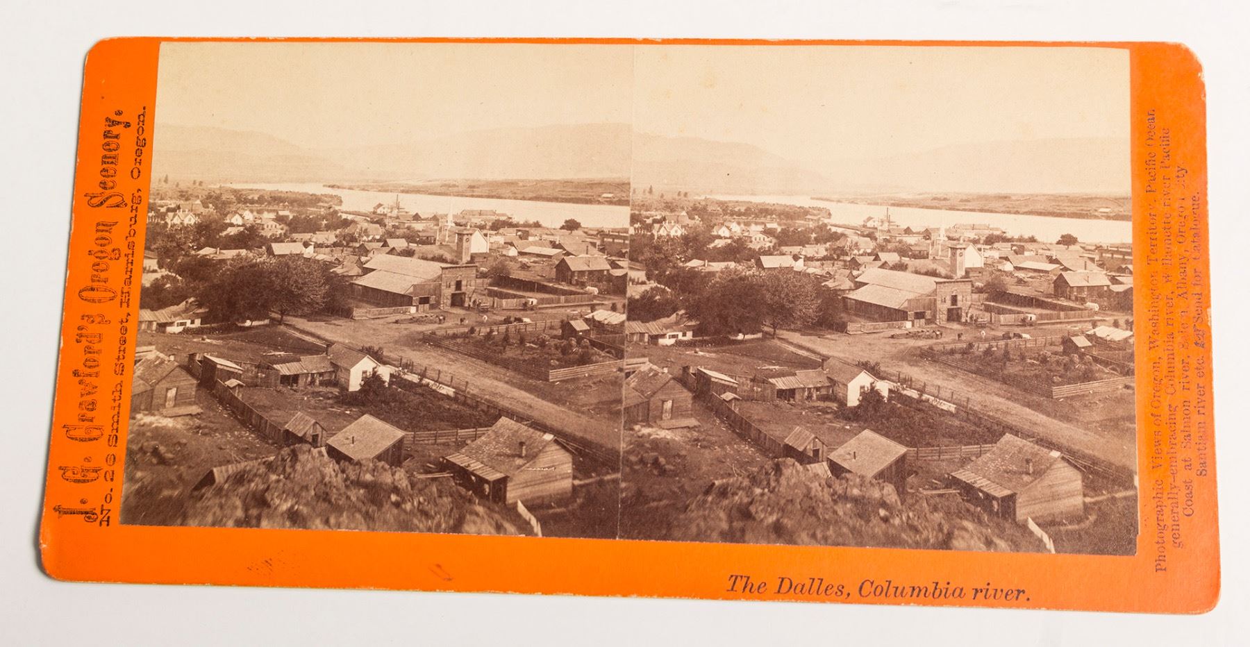 Nice early bird's-eye view of The Dalles along the Columbia River by J.G. Crawford, No. 26 Smith Street, Harrisburg, Oregon. Medium contrast. Some soiling. According to Mautz, Crawford had this Harrisburg studio from 1877-1884. (Prag Collection) Date: Location: The Dalles, Oregon HWAC # 54707
