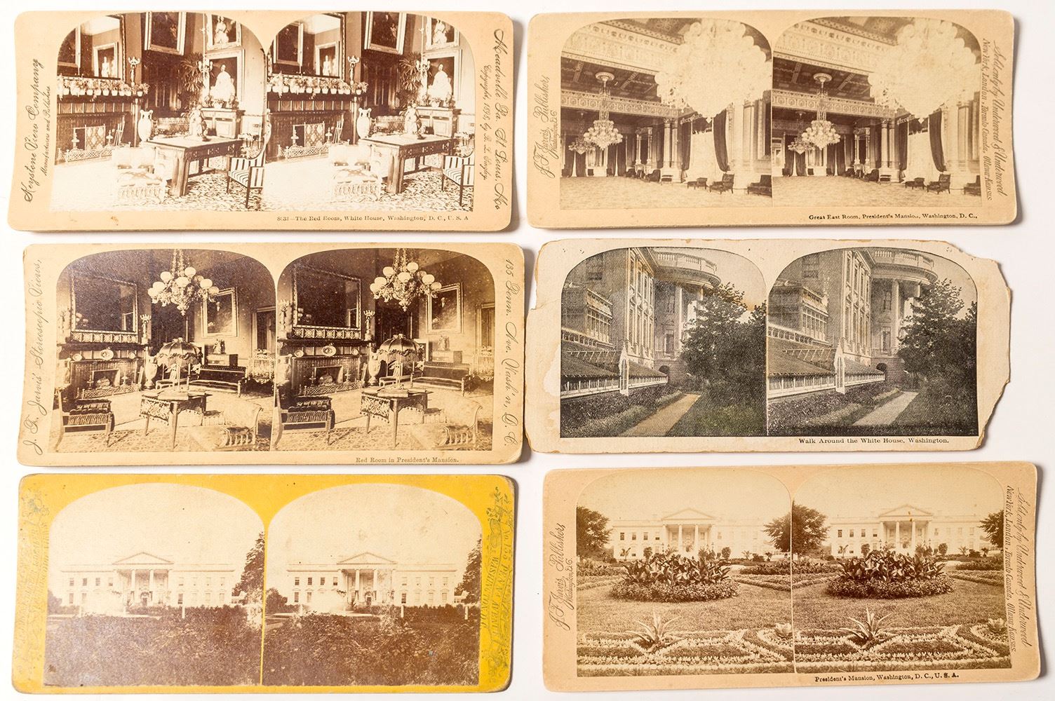 Lot of 6 different of the "President's Mansion." Includes: exterior view by J.F. Jarvis; different exterior (Underwood & Underwood); closer exterior, no photographer, poor condition; interior of Great East Room (Underwood & Underwood); and two different of the Red Room (Keystone and Jarvis). Mixed condition. Please inspect. (Prag Collection) Date: Location: Washington, District of Columbia HWAC # 50692