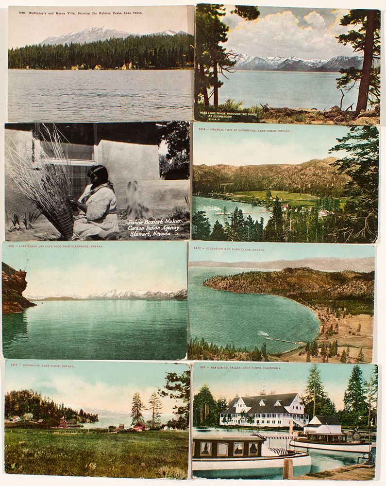 Lot of 8 early postcards. 1) Glenbrook. Mailed in Glenbrook, 1914. Mailer mentions spending time at Tahoe Tavern. 2) Glenbrook. "On the Line of the Overland Limited and Lake Tahoe Steamers." 1911. Unused. 3) The Casino, Tallac. Steamer in foreground. Mailed in Oakland, 1908. 4) McKinney's and Moana Villa. Pacific Novelty Co. Unused. 5) Glenbrook Bay. Steamer at dock. Mitchell. Unused. 6) Second overview of Glenbrook with steamer. Mailed in Tahoe, 1911. 7) Cave Rock. Mailed in Glenbrook 1906. 8) Paiute Backet Maker RPC. Carson Indian Agency, Stewart, Nevada. Unused.