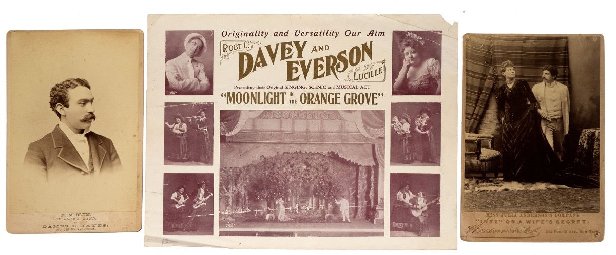Three pieces. 1) Handbill advertising Robert L. Davey and Lucille Everson Presenting their Original Singing ,Scenic, and Musical Act "Moonlight in the Orange Grove." Multiple photographs. 190-. Rips and folds. 12.5" x 9.5" 2) Cabinet card for Miss Julia Anderson's Company "Inez" Or a Wife's Secret. Photograph shows a man and woman on a set. New York photographer Heismental, c. 1880s-1890s. Pin holes and glue residue on reverse. 3) Cabinet card of M.M. Blum of Blum's Band. Photographer is Dames & Hayes in San Francisco. According to Mautz, they were active at this address from 1877-85. Minor foxing. City: State: United States Date: hwac# 25365