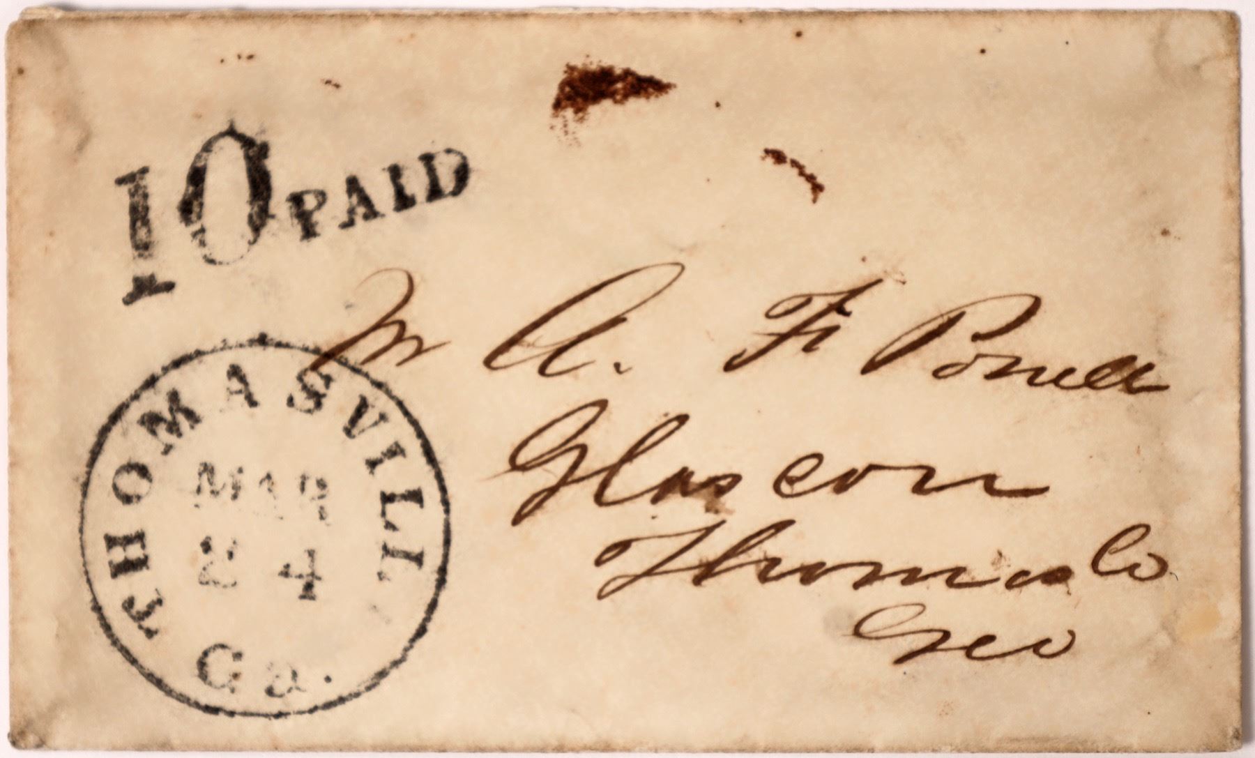 Postmarked Thomasville, Ga., Mar. 24. Not dated, but by 1855 stamps were required. 10 PAID killer. Addressed to Glasgow, Thomas County. Thomasville is the county seat of Thomas County. It borders Georgia and was founded in 1825. Named for War of 1812 General Jett Thomas. Glasgow was settled by Scottish immigrants.