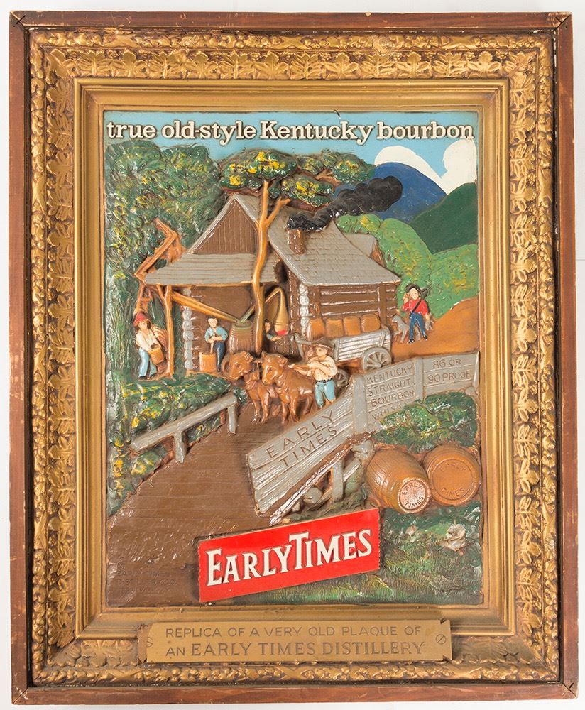 Plaster, multi color sign with replica of a very old plaque of an early times distillery. It pictures the distillery, 3 men working, oxen pulling cart with whiskey barrels over a bridge. Wood frame, with condition issues of chipping. Could be attractive on back bar area. 22.75"x 27.75". Date: Location: HWAC# 56758