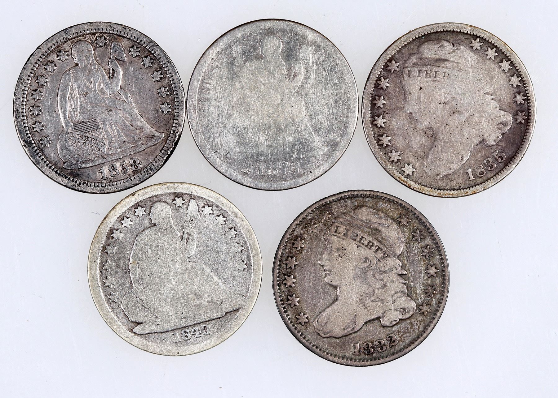 Lot of five U. S. dimes from the 1800s: 1) 1832, G-VG; 2) 1835, AG-G; 3) 1840-O (no drapery) AG-G; 4) 1858, VG-F; 5) 1873-S (arrows), AG-G.