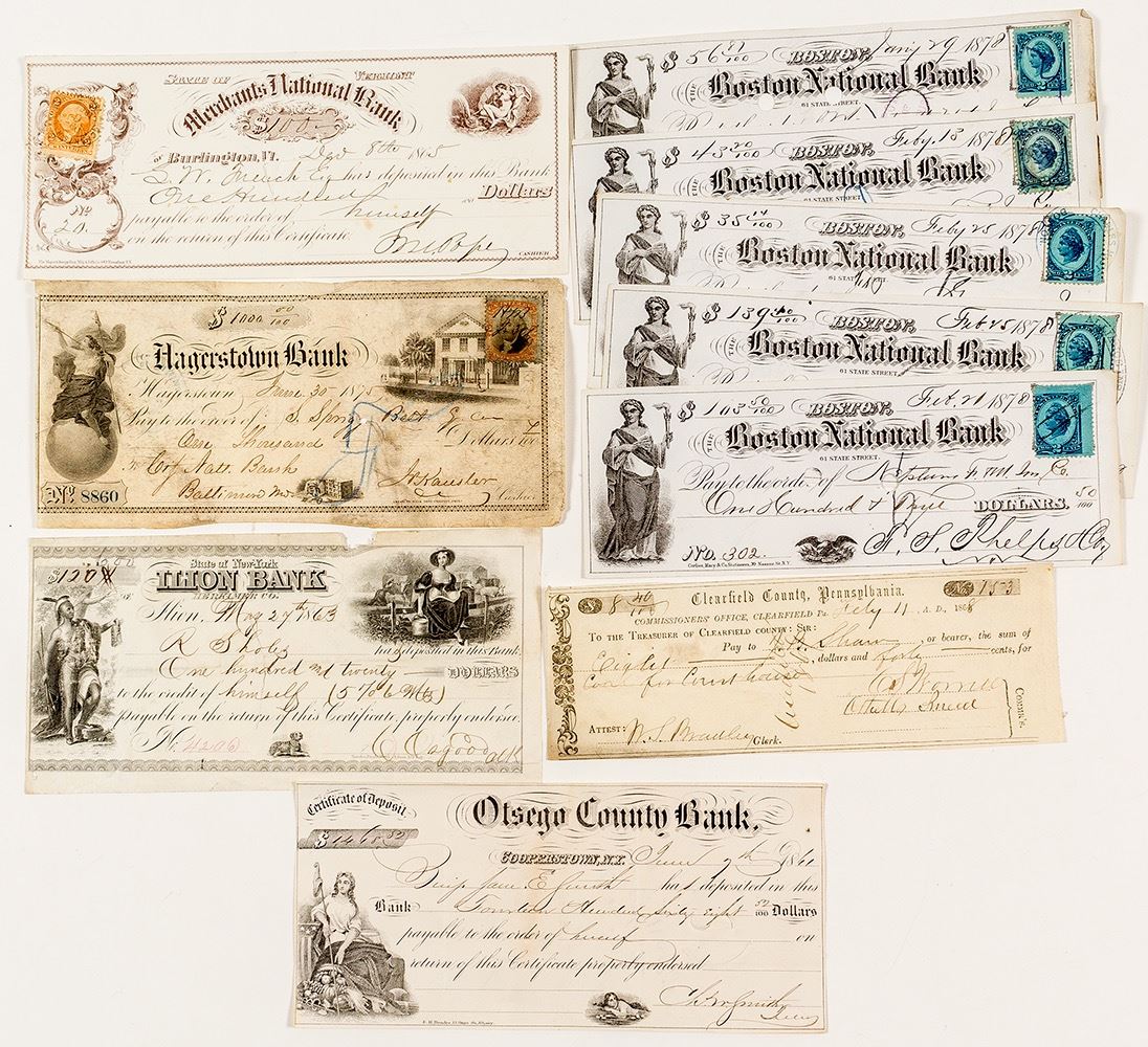 1) Otsego County Bank, Cooperstown, NY, 1861; 2) State of New York Ilion Bank, Herkmer Co., 1863; 3) Merchants National Bank, State of Vermont, 1865, adhesive revenue stamp; 4) Clearfield County, Pennsylvania, 1868; 5) Hagerstown Bank, 1875. 6) Group of checks from Boston National Bank (1870s) w/ adhesive revenue stamps. City: State: Date: 1861-1875 Inventory# 38609