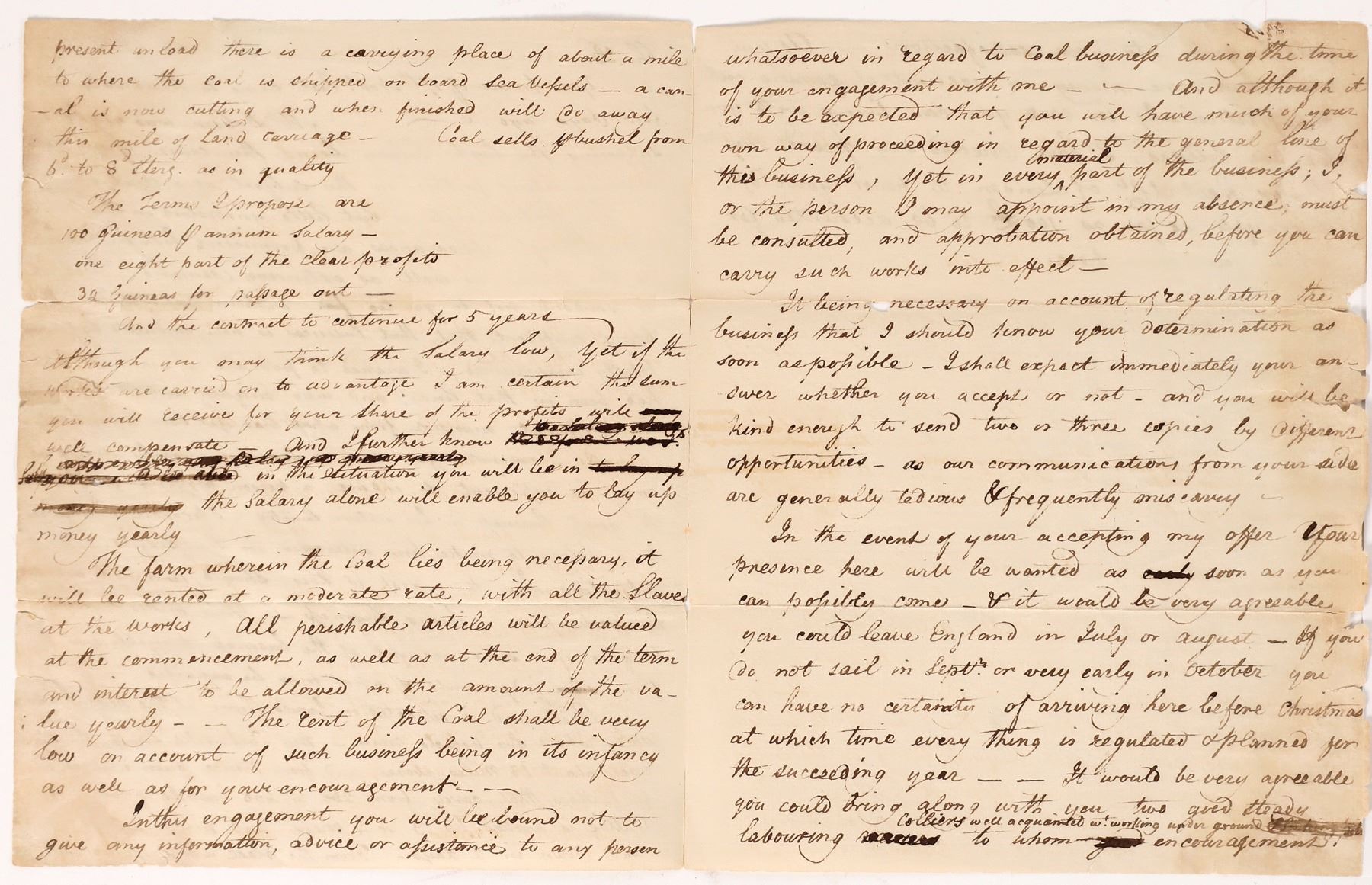 An historically important letter from Virginia, detailing the development of the coal mining industry in the state. The owner of a Richmond mine writes to a mining engineer in England, imploring him to come to America to oversee the operation: "The coal business us but little understood in this country and although appearances are promising...". It includes a description of slave labor and building a canal. While the 4pp letter is undated, the information in it indicates an early date of coal mining at Richmond - perhaps in the opening few years, c1750. The first production of coal there was reported as 50 tons in 1748. A canal was built along the north of the river. After this letter was written, Patrick Henry gave his speech at Richmond "Give M Liberty or Give me Death." The letter was written to "Th. B.", and the writer appears to have a partner in Richmond, John Dobson, who may have been the man of the same name very active in the tobacco trade through the 1780s.The letter appears to be the writer's personal copy. Virginia