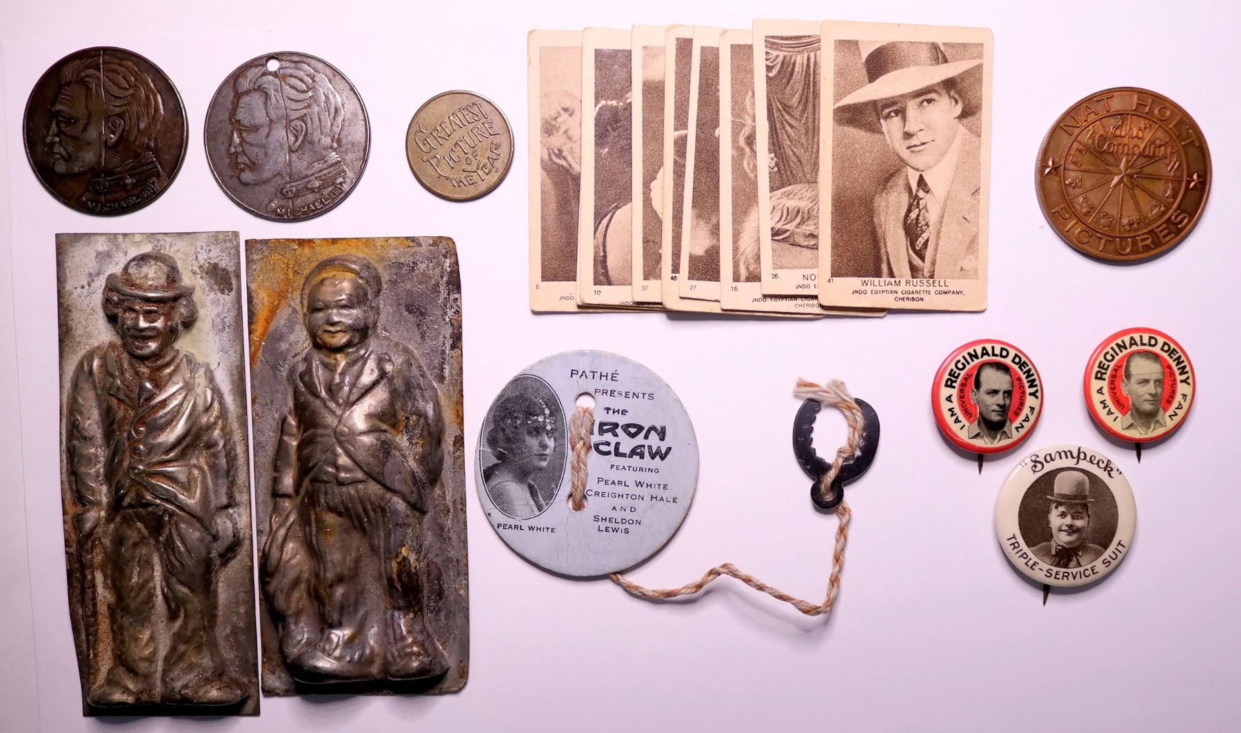 These are cigarette paper photograph cards and tokens. The photo. cards included with cigarette papers of the JNDO Egyptian Cigarette Company are of silent film actors Betty Blythe (1920's) who once claimed that the 28 costumes that the studio provided her could "all fit into one shoe box". (This was before cinema censorship). Pearl White from 1911-1920's silent movies, serials, and stage plays once made $3000 per week while working in London only to die at age 49 due to liver failure. There is a movie release card from the movie IRON CLAW which includes a circular photo card and suspended little metal claw memento featuring Pearl White. And there is Tom Mix, an original cowboy and the first genre film cowboy to define the western movie from 1909-1925. Known for mentoring John Wayne from back studio prop handling. He was a pallbearer at Wyatt Earp's funeral in 1929 and died at the wheel of his 1937 Cord Phaeton in 1940. There are nine actors in all, including three mentioned above along with William Russell, Norma Talmadge,Dorothy Dalton, Violet Hopson,Harry Carey, and Alice Joyce (once married in Virginia City, Nevada). Most if not all of these film stars are lost to history as most of their works have been lost to the ravages of time. A token broken coin advertising the movie Micheal 111 is included. A coin advertising Paramount Pictures features five of its movies. There are two candy mold tins of Fatty Arbuckle and Charlie Chaplin.