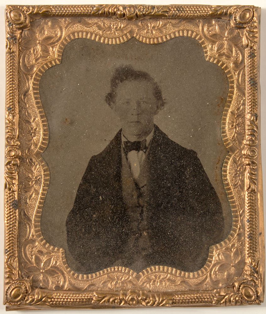 Very early photograph of a well-dressed young man. Encased in glass frame with metal border. Possibly c.1850s? Measures 2 3/4" x 3 1/4"