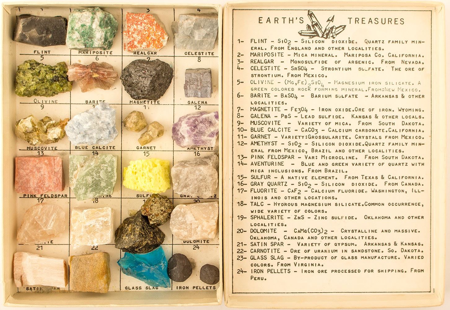A collection of 24 minerals in a white cardboard box measuring 5" x 7". Many of the minerals are 1" cubes. Pink feldspar, muscovite, fluorite, galena and more. The box exterior has a sticker "24 Earths' Treasures" and written in ink Mineral Samples. Manufacturer is unknown, possibly c. 1960's HWAC# 50235 Date: Location: