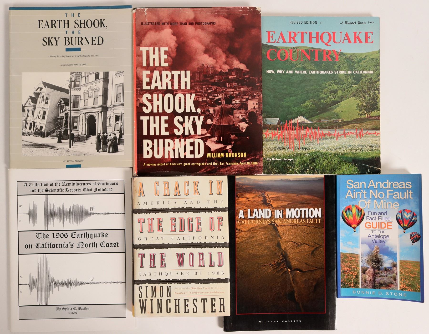 Lot of 7. Included: A Land in Motion, California's San Andreas Fault, Collier, 1999, sc; San Andreas Ain't No Fault of Mine, Stone, 2005, sc; A Crack in the Edge of the World, Winchester, 2005, hardcover; The 1906 Earthquake on California's North Coast, Bartley, 2006, sc; Earthquake Country, Iacopi, 1972, sc; The Earth Shook, The Sky Burned, Bronson, 1986, sc; same but 1959 edition.