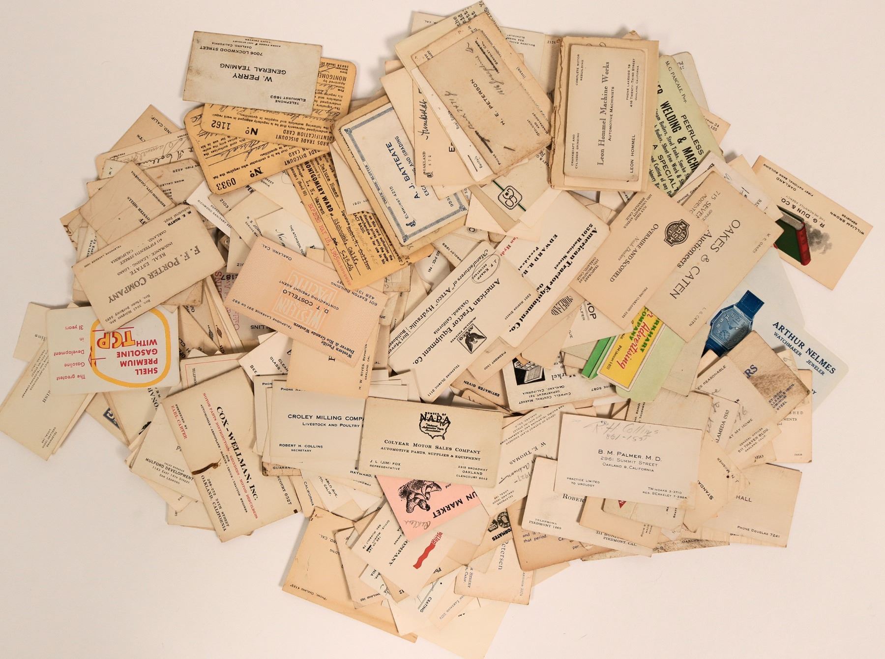 Lot of 200+ business cards from East Bay locations such as Oakland, Richmond, Berkeley, Hayward, and others. Some pictorial. Duplication. Businesses such as: Trojan High Explosives and Blasting Supplies; Ben Wood Horse Breaker (pictorial); Union Oil Co. of CA; Peter Pan Stores; Oakland National Market (pictorial); Bill Bros. Poultry & Livestock (pictorial);Peerless Welding & Machine Works; and many many more. Please inspect.