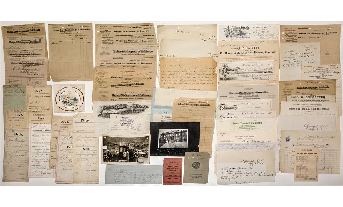 Large lot (over 40 pieces) of business receipts, deeds, letters and photos dating from 1890 through 1910. Various East Bay cities: Alameda, Oakland, Berkeley, Emeryville.