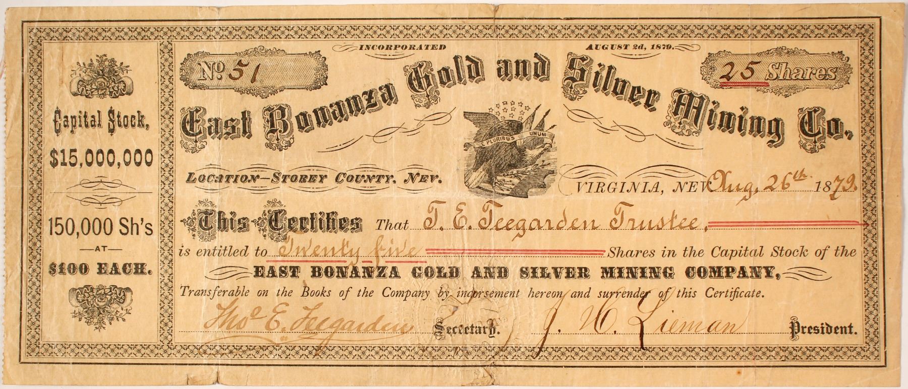 # 51 for 25 shares to TE Teegarden trustee.Signed by secretary Thomas Teegarden And president JH Lieman. (Teegarden and Lieman located a claim under the name of Lieman in November of 1878. It was 700 linear feet in the Virginia District between the Pioneer mine, the Mountain View and North Milton. Teegarden located the Teegarden claim in March of 1879. It was 1000 feet in the Flowery District. It was a relocation of part of the Yankee Jim. On August 1, 1879 Thomas T Teegarden filed a notice of location on the Guadalupe lode on the east by the Rocky Bar, west by the Scorpion and formerly known as the Silver Wedge. (This is most likely the East bonanza.) He was still looking for the pot-of-gold at the end of the rainbow.) Incorporated August 2, 1879. Issued Virginia, Nev. 1879. Location Storey County, Nev. Eagle vignette. Rips at borders. Holes at stamp. Fair condition. State: Nevada City: Flowery Mining District Date: 1879 HWAC# 85276