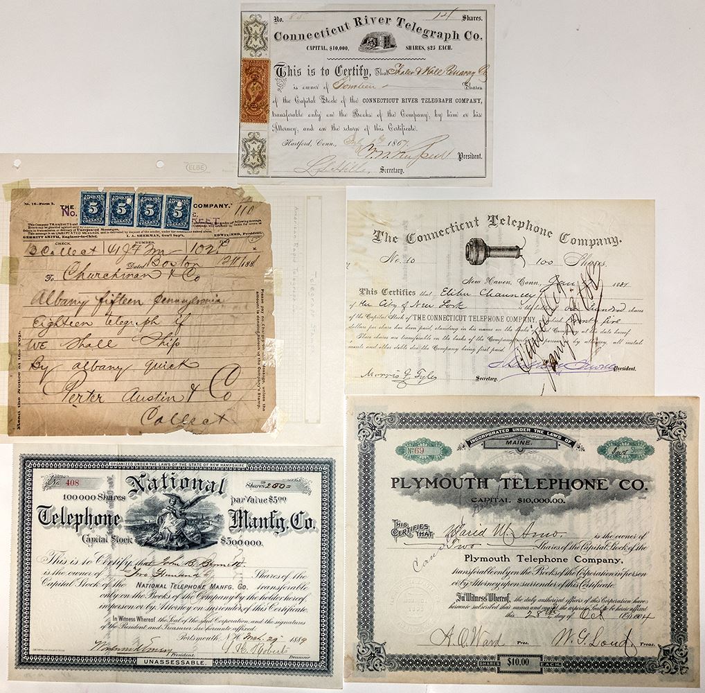 Lot of five: American Rapid Telegraph stamps,(1881), Connecticut Telephone Co. (1881), National Telephone (1889), Connecticut River Telegraph (1867),Plymouth Telephone Co. (1904). From the Weber telephone and telegraph collection.