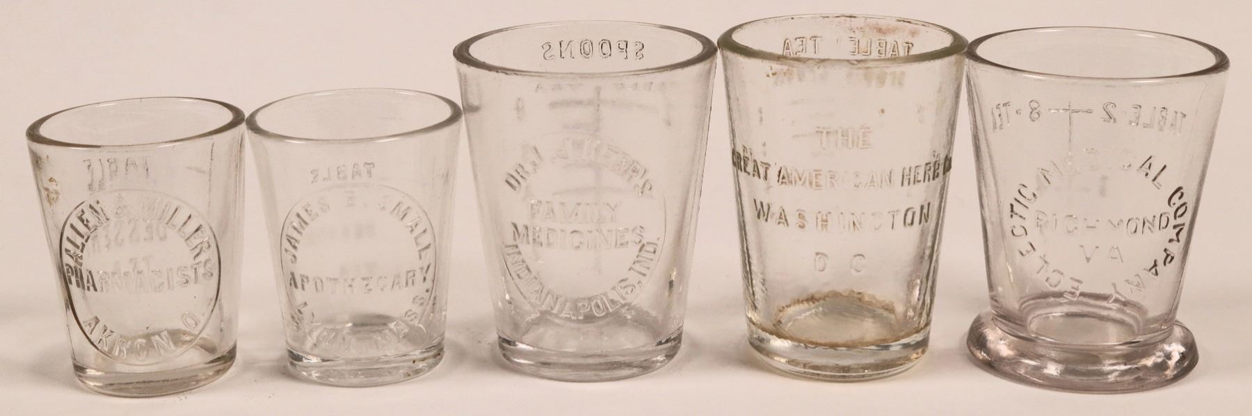 Five vintage embossed dose glasses. Small, Lynn Mass.; Great American Herb, Wash DC; Kerris, Indianapolis; Eclectic Medical, Richmond VA; Allen & Miller, Akron, OH.
